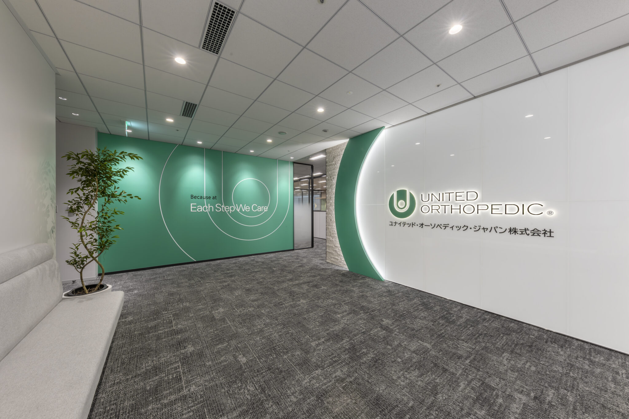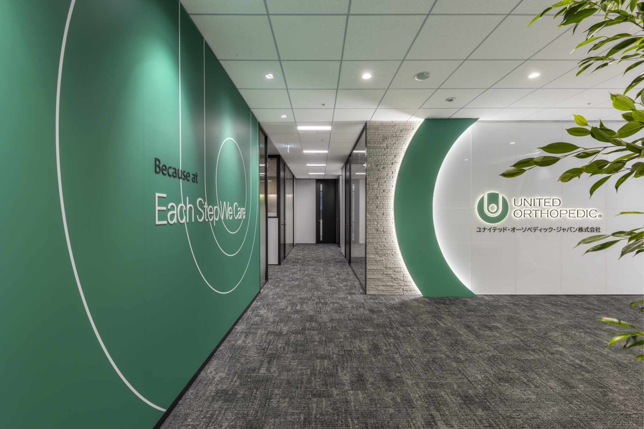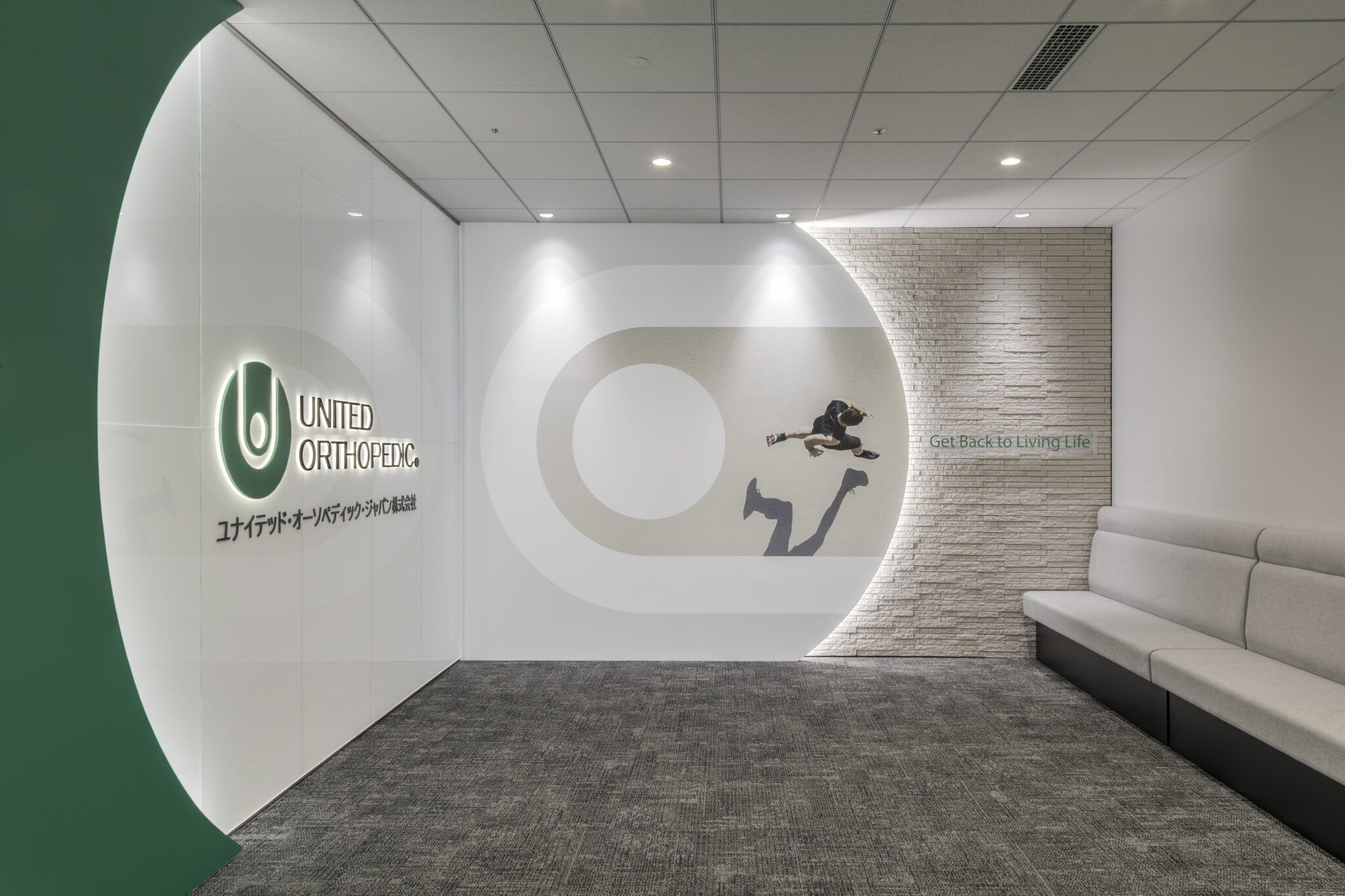 医療機器メーカーとしての信頼感とブランドメッセージを空間で表現することをテーマに、エントランスから執務エリアまで一貫したデザインで構築しています。