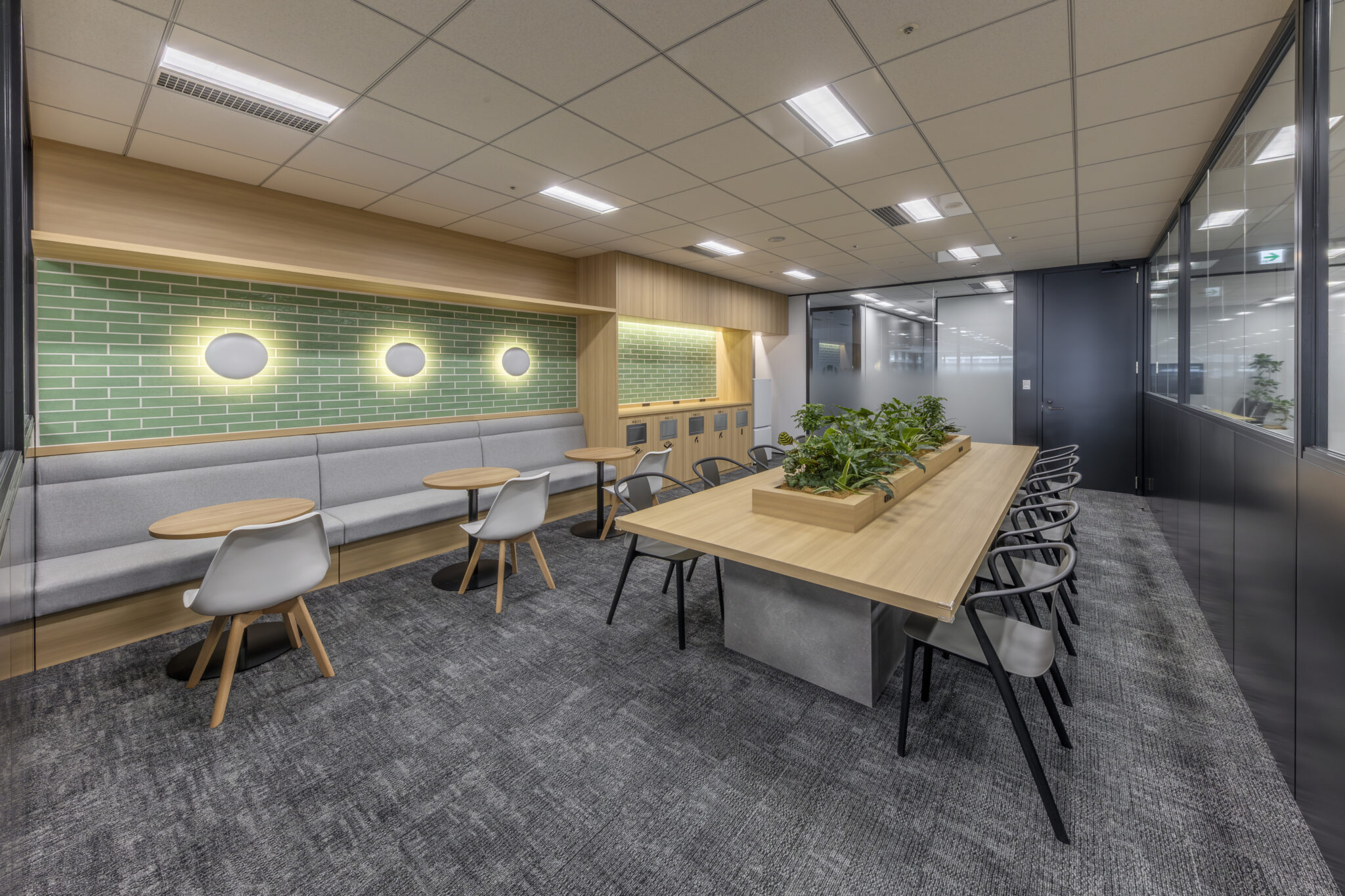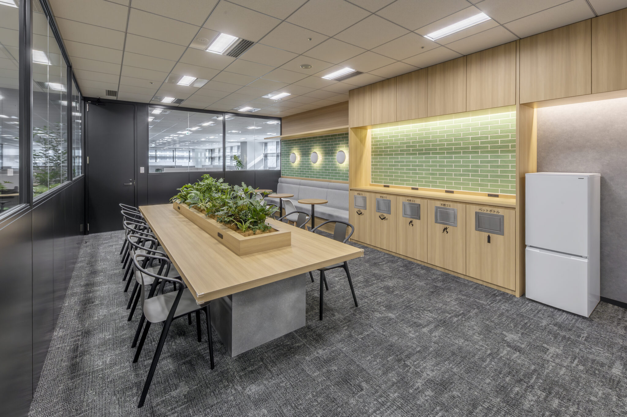 リフレッシュエリアは木とコーポレートカラーであるグリーンを基調とし、社員が気軽に集まり会話が生まれたり、ほっと一息付くことができる、温かさを感じることができる空間としました。