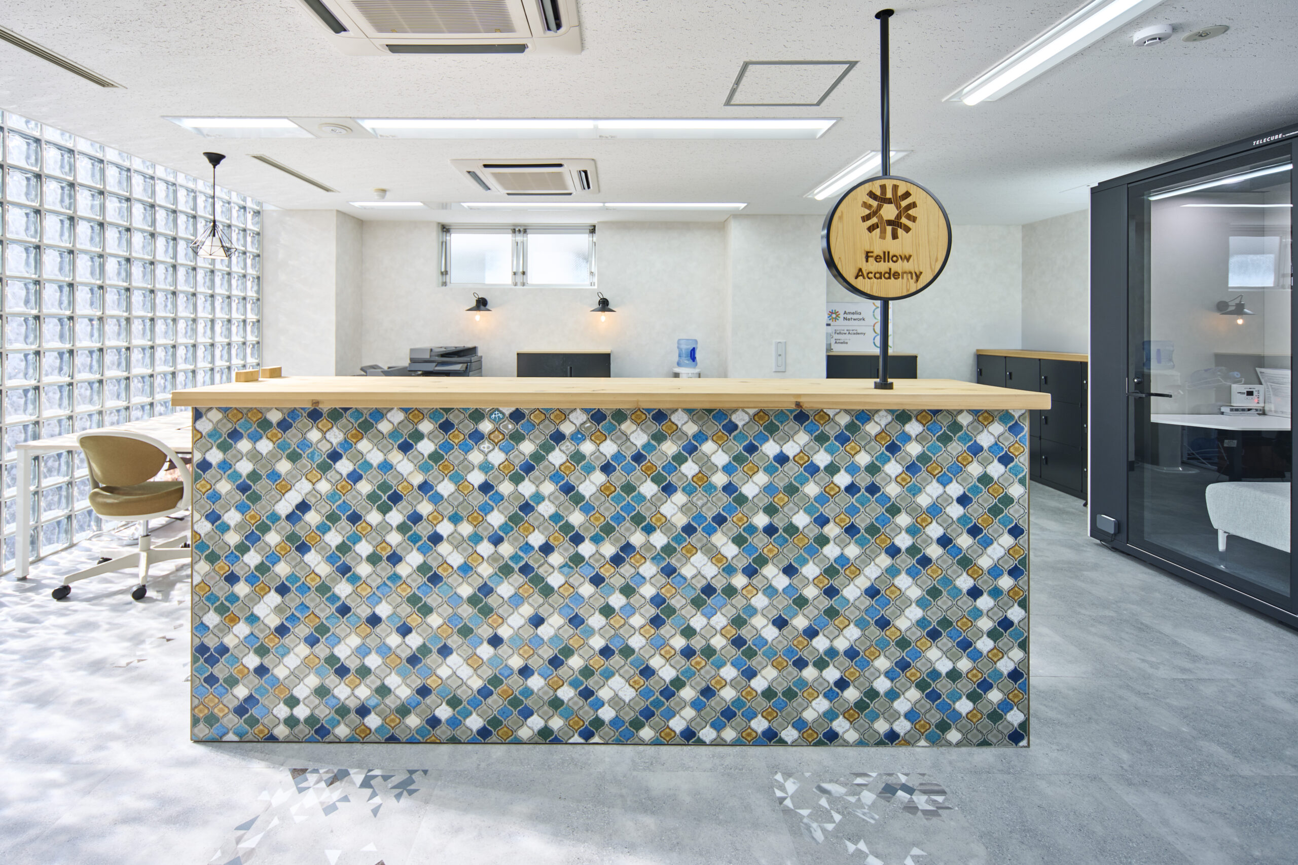 エントランスの顔となる受付カウンターには、お客様が大切に使われてきた既存のカウンターを活用し、年月を重ねて深みを増した木製天板を残しつつ、伝統的な色合いのランタン形モザイクタイルを加えることで、これまでの歴史を引き継ぎながらも新たな表情を生み出しました。