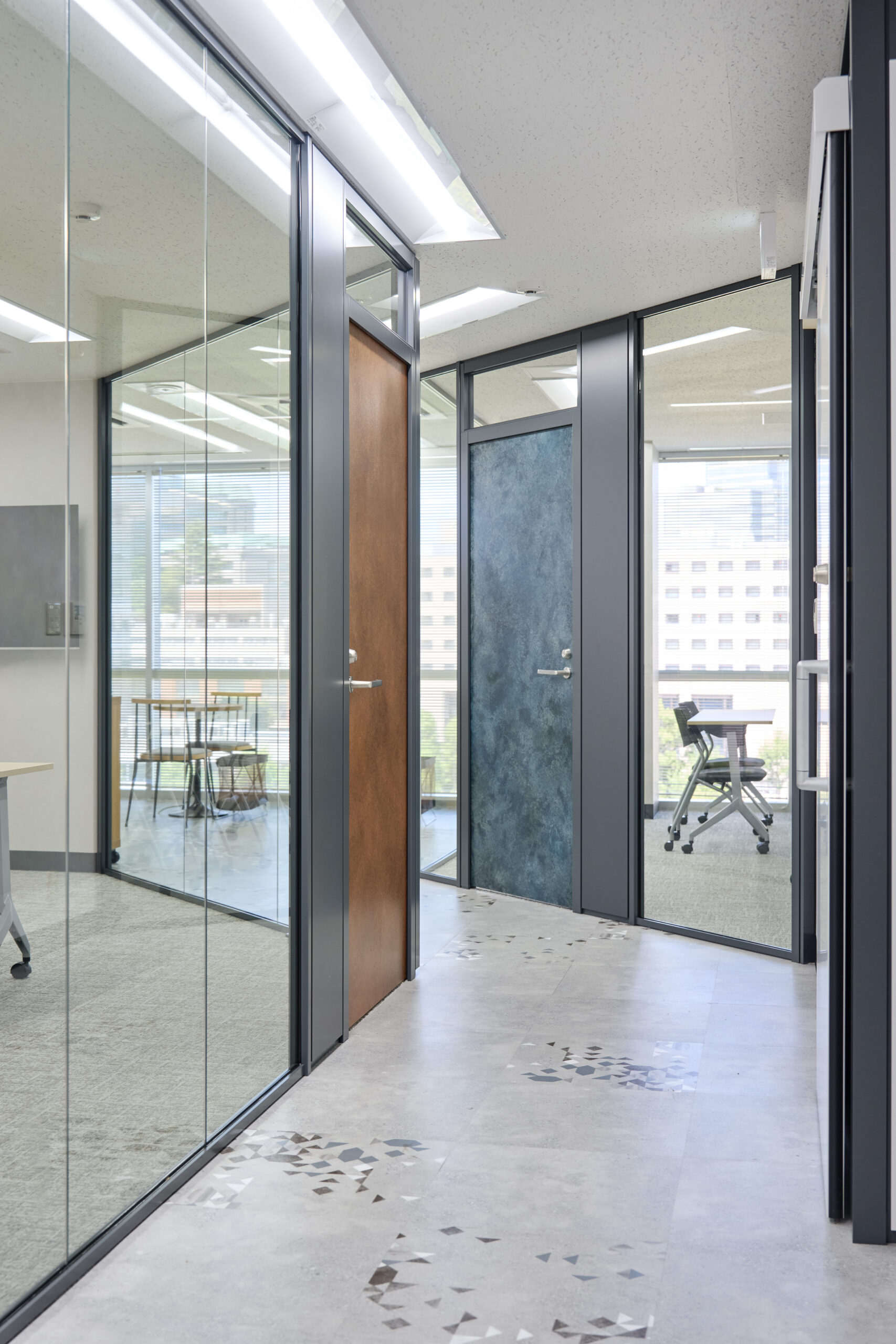 また、「教室の扉の印象を変えたい」というご要望に応え、生徒たちを迎える扉には職人によるエイジング塗装を施しました。時間の流れを感じさせる風合いと、一枚一枚異なる表情が重なり合い、唯一無二の温もりある空間へと生まれ変わっています。