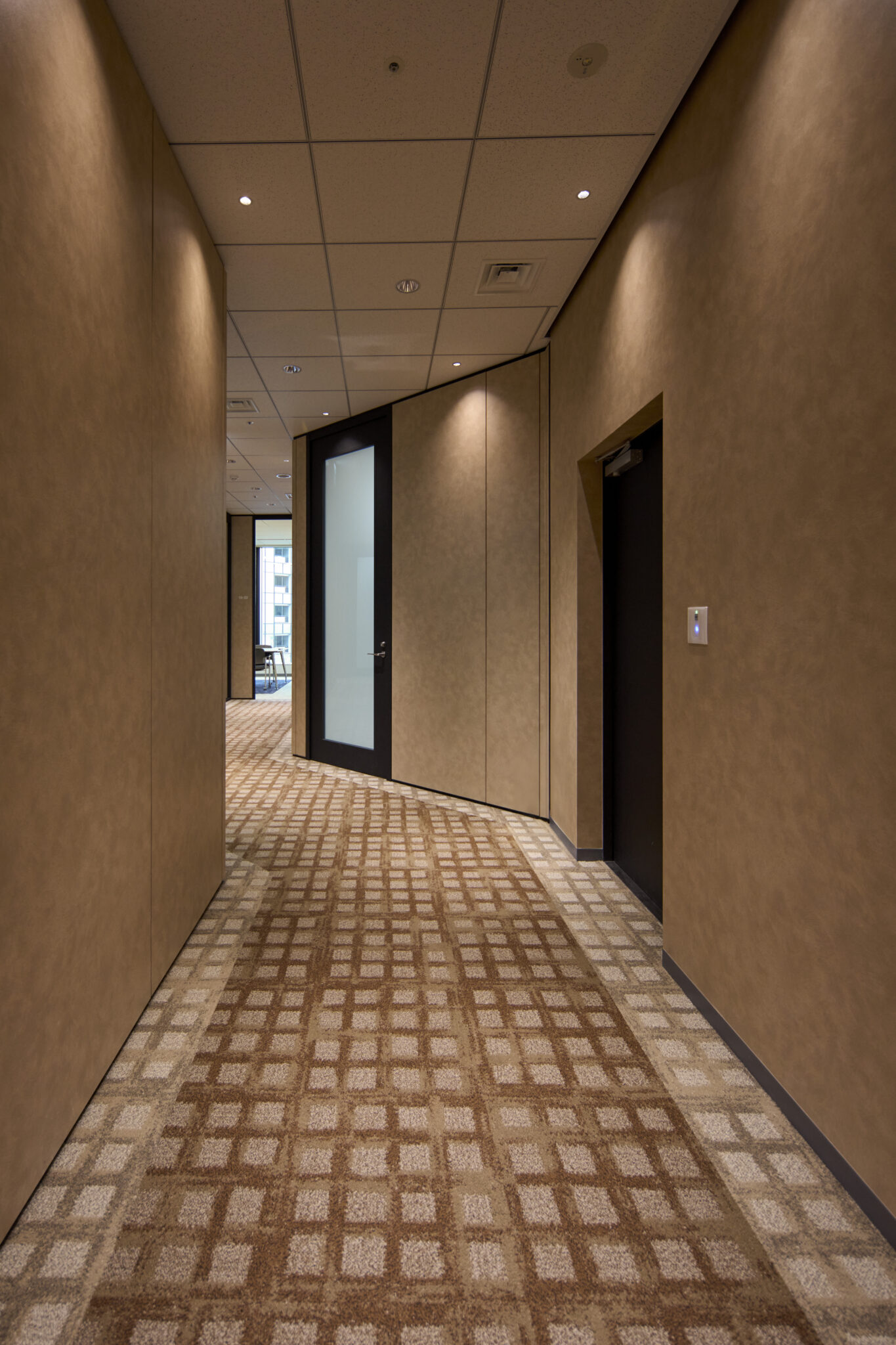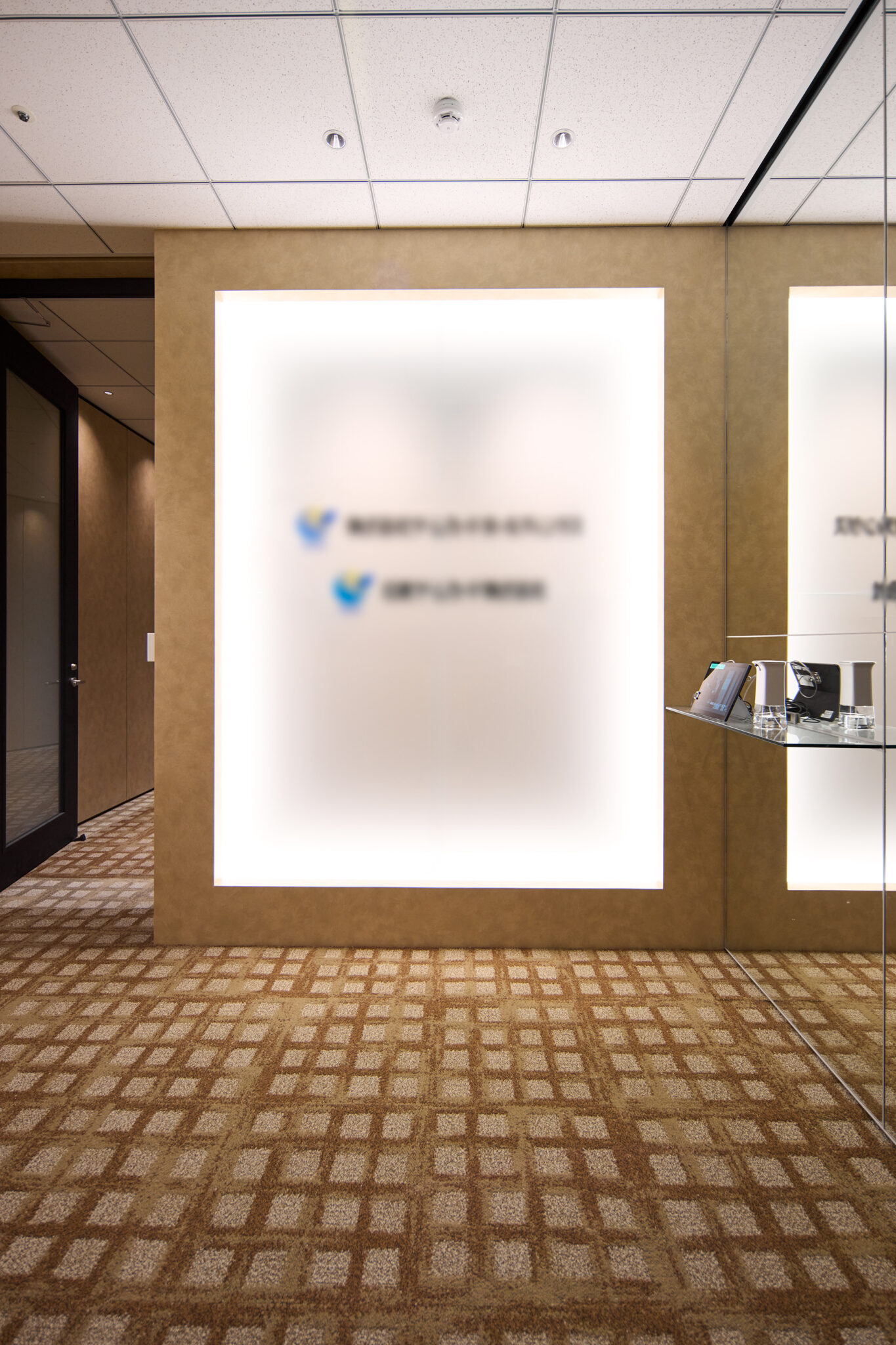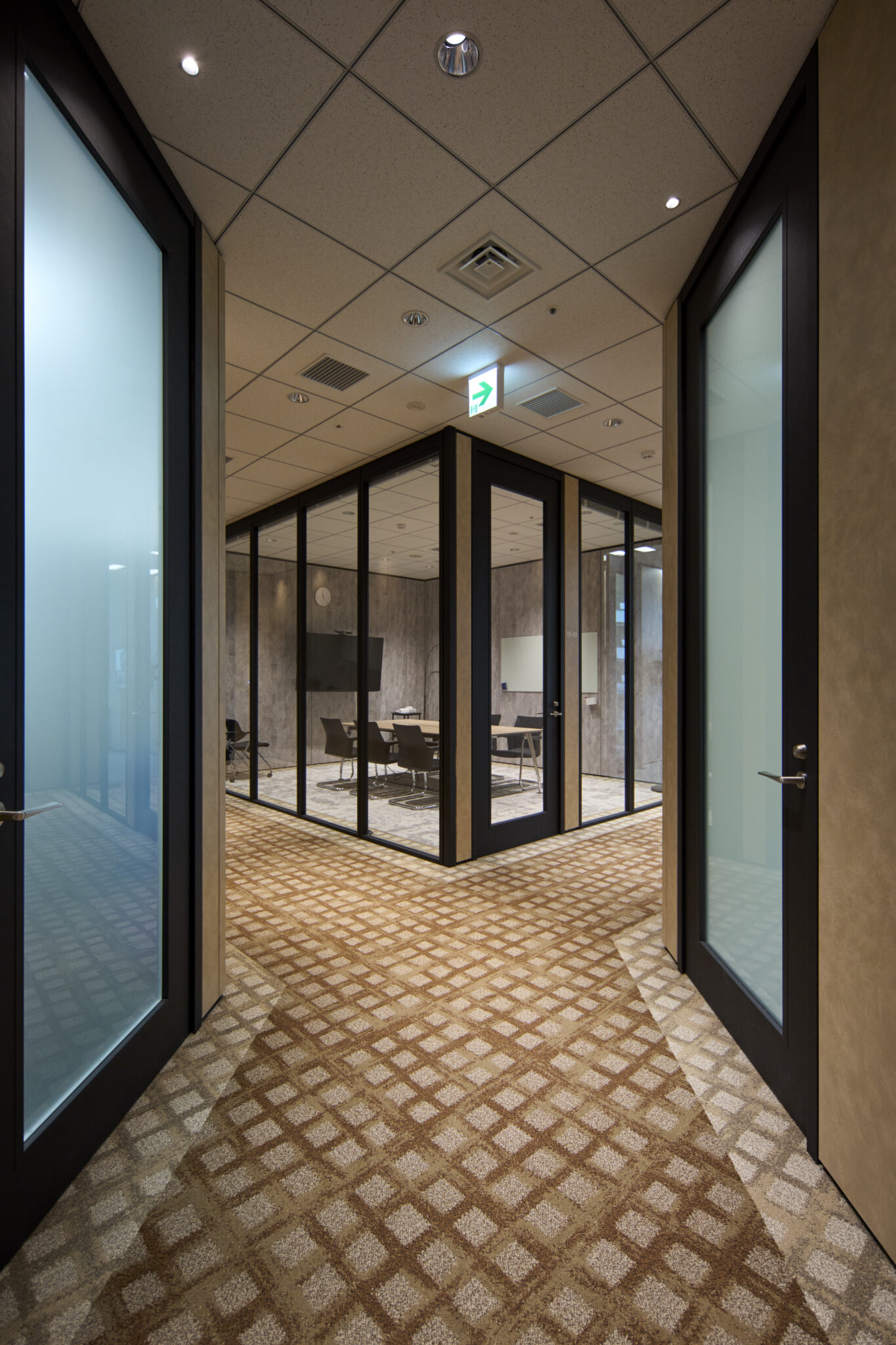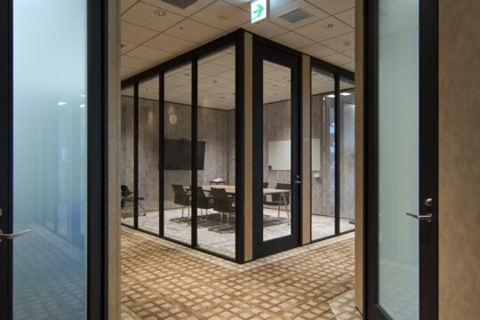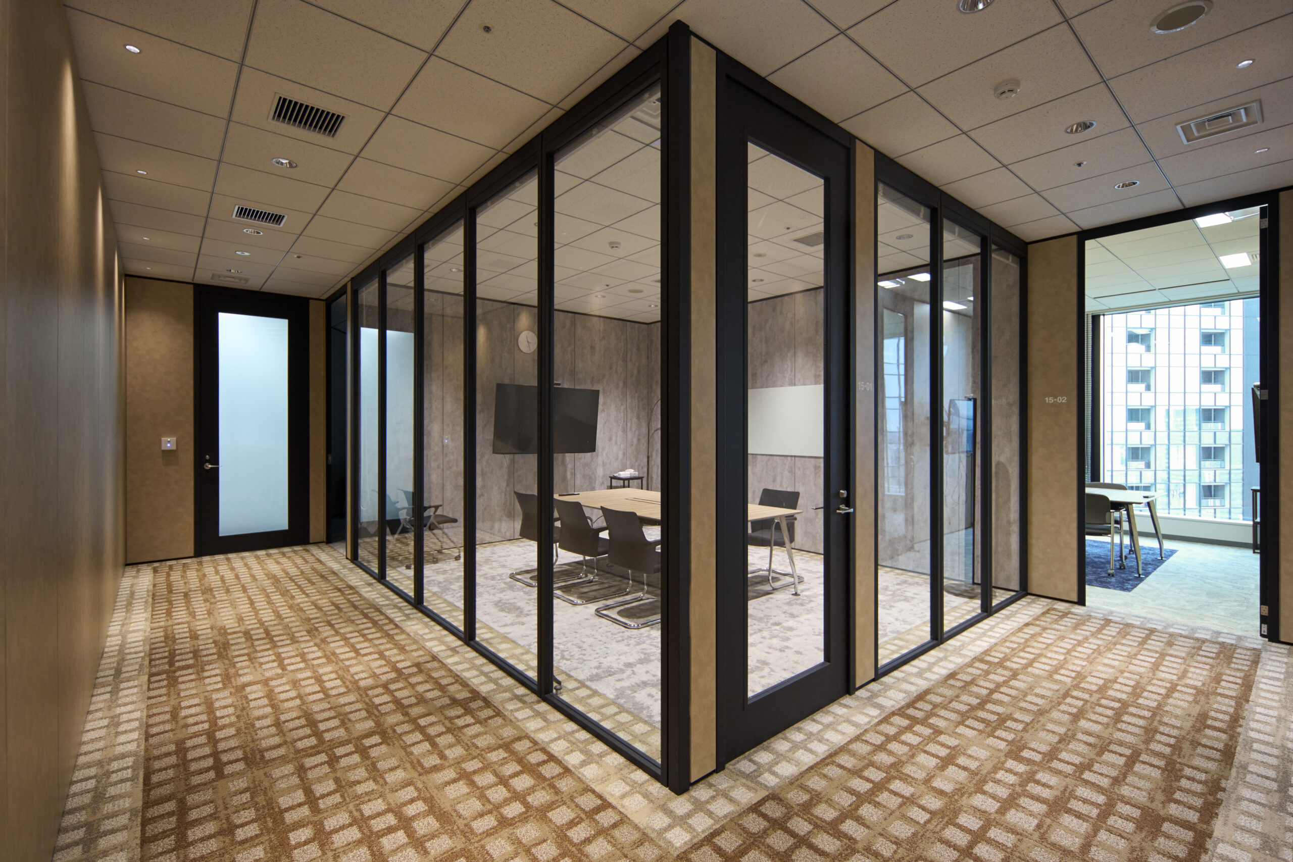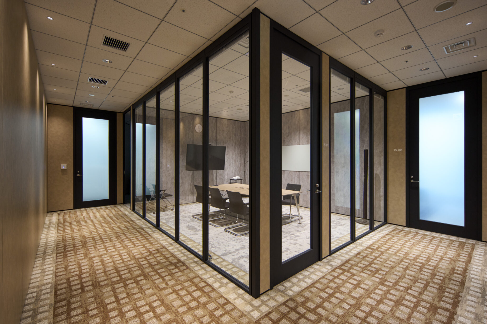 特に中央の会議室では、防火ガラスの無骨な質感をあえてデザインアクセントとして活かし、割付や枠のシート品番に至るまで細部にこだわりました。