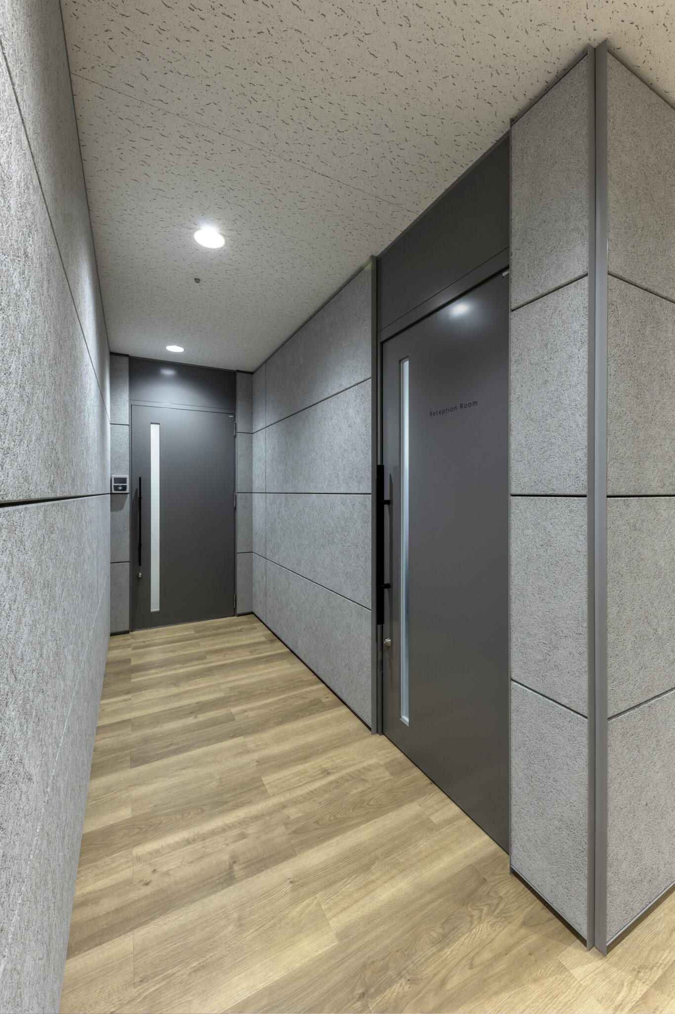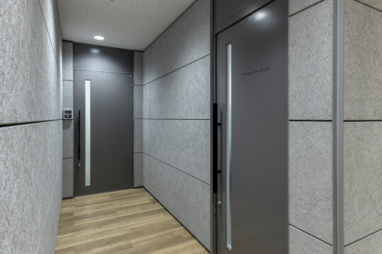 エントランスの内装では、「紙媒体の情報をデータ変換する」という事業内容をヒントに、紙や木を感じさせる素材を採用し、整然と並ぶ縦横ラインの意匠で精密性や信頼性を表現しました。