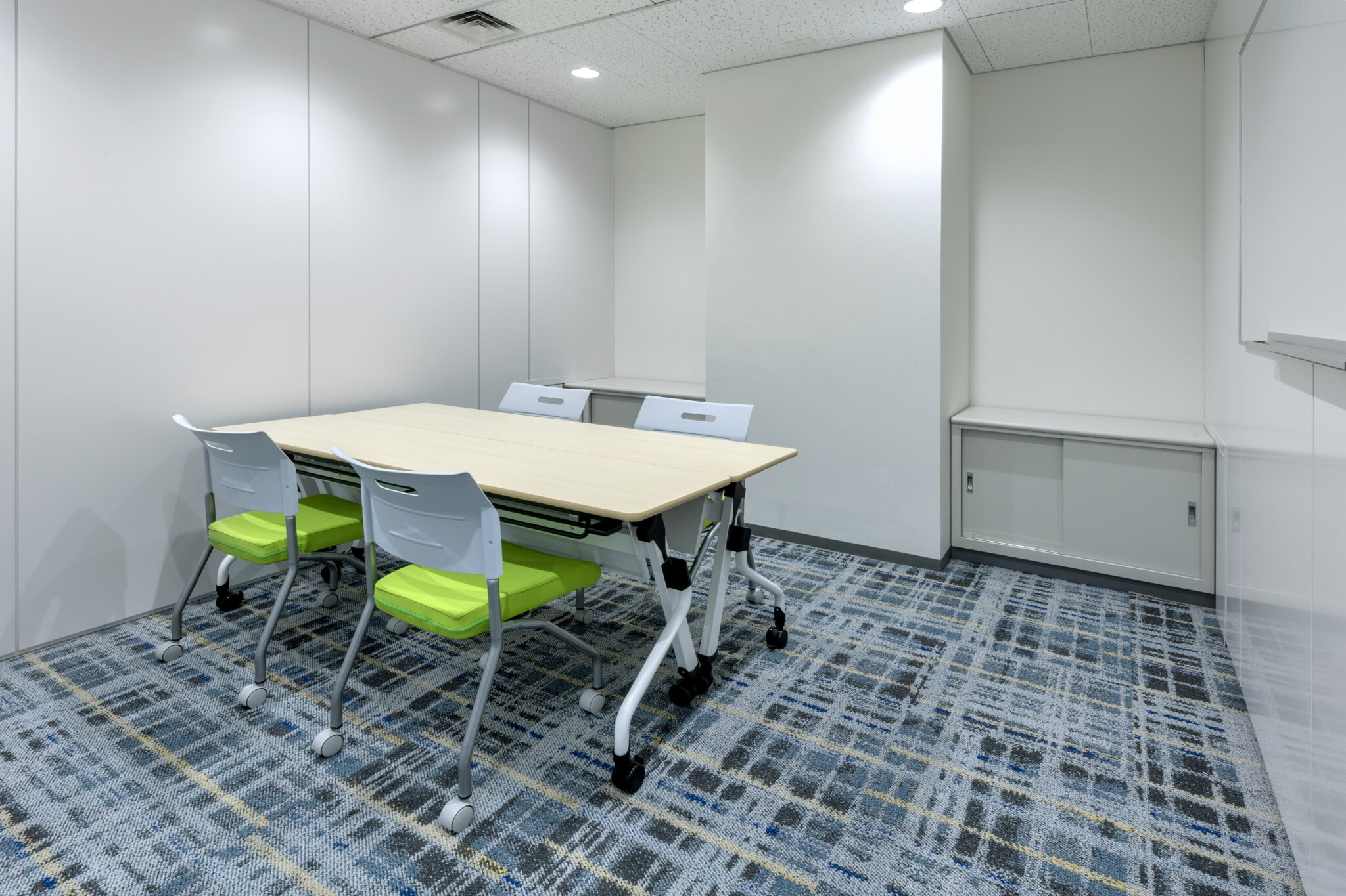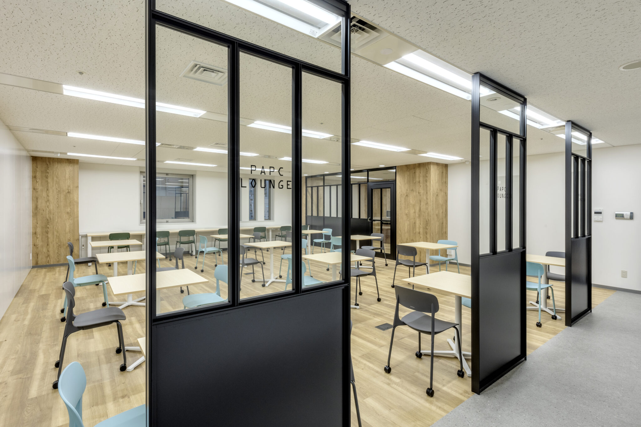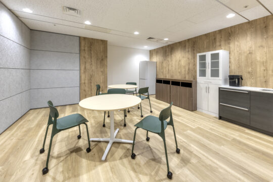 また、リフレッシュエリアは部署間を超えたコミュニケーションが生まれるように、木目や格子をアクセントに温かみのある雰囲気に作り上げ、リラックスできる環境に仕上げました。