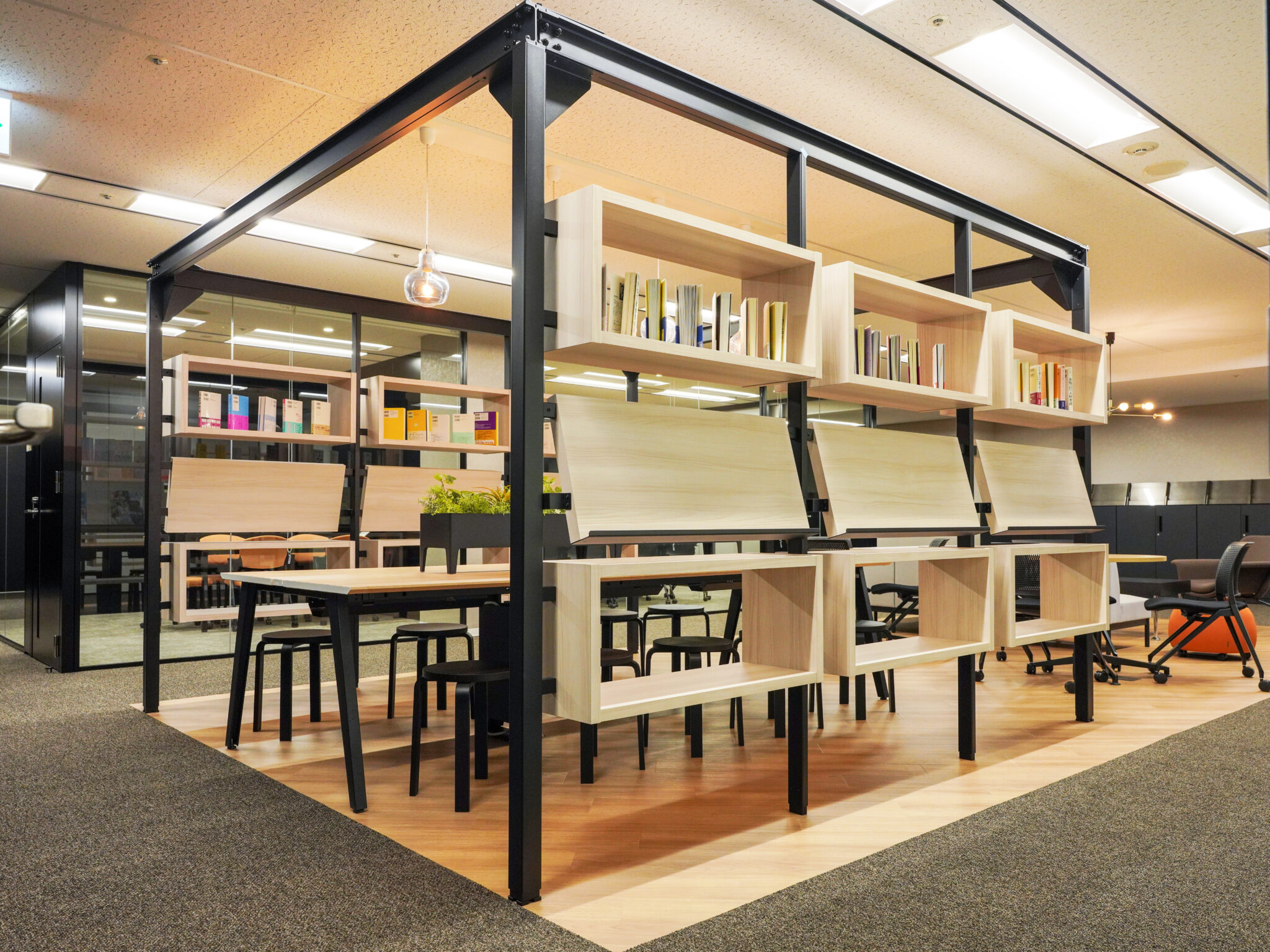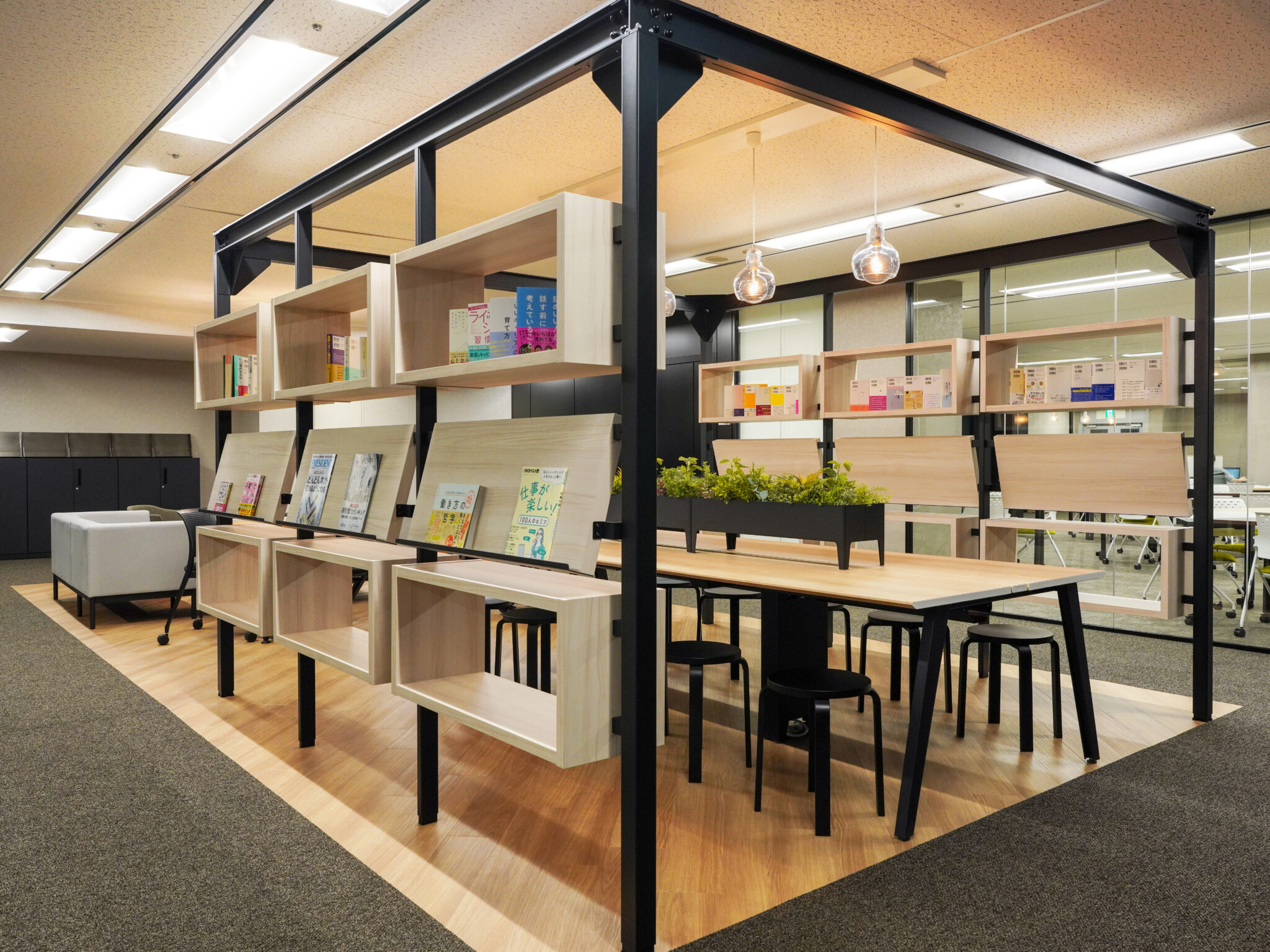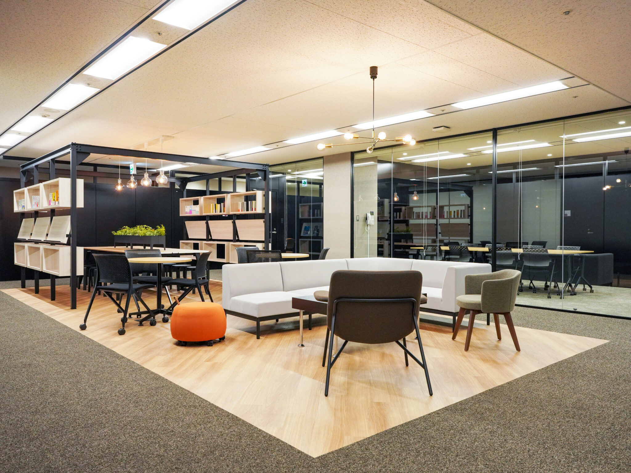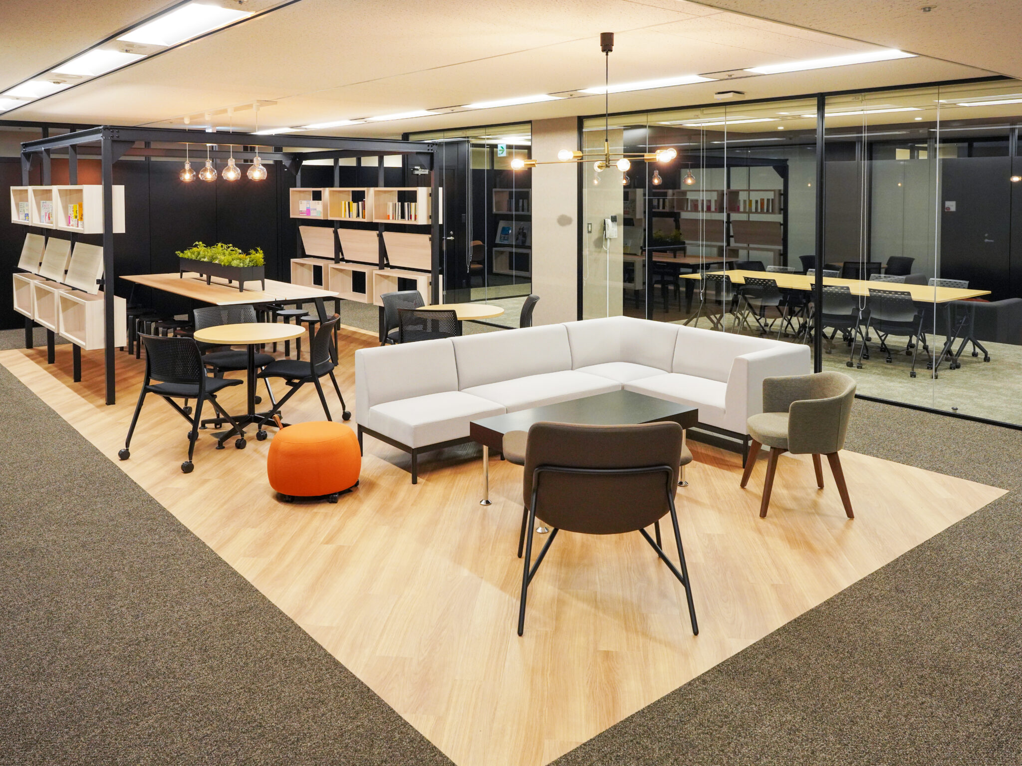 大人数を収容できるセミナールームは、グループワークにも講義スタイルにも自由に変更できるようなエリアになっています。人が集まりやすいエリアの中心には、カフェのように『ほっ』とできる場所をつくり、ソファでくつろぎながら情報収集や、雑談ができるスペースや、フレームに囲まれながら書籍を読んだり、軽い作業が行えるようなスペースを設けました。