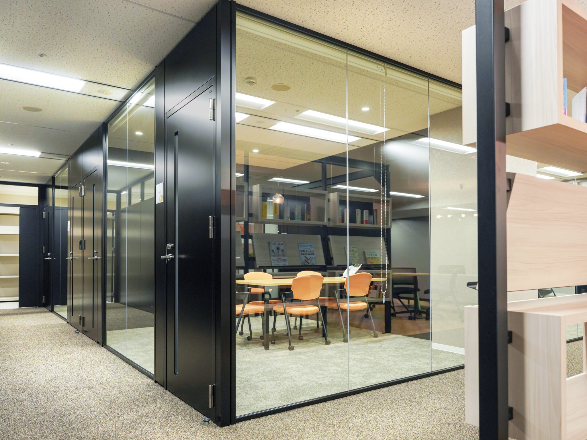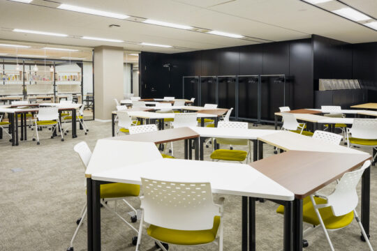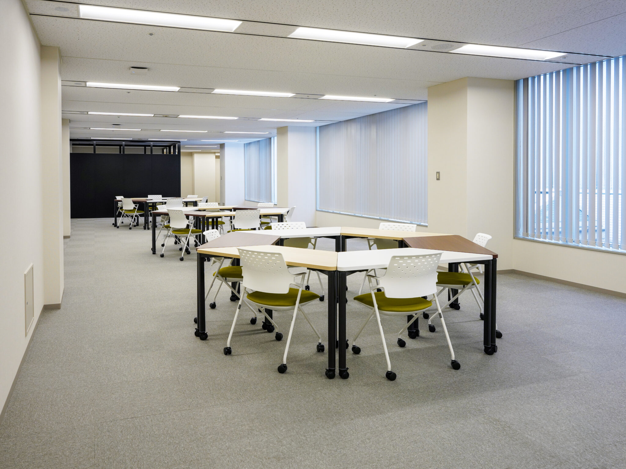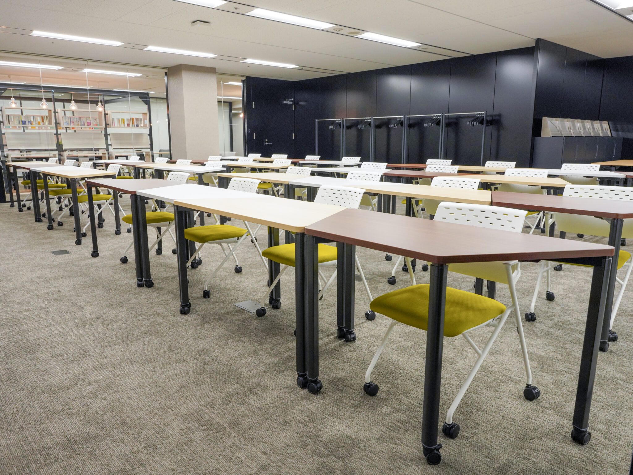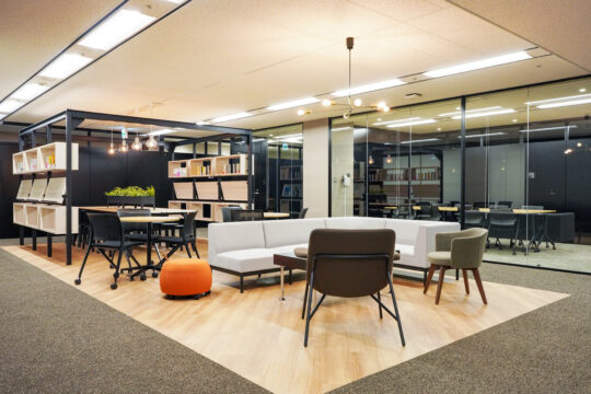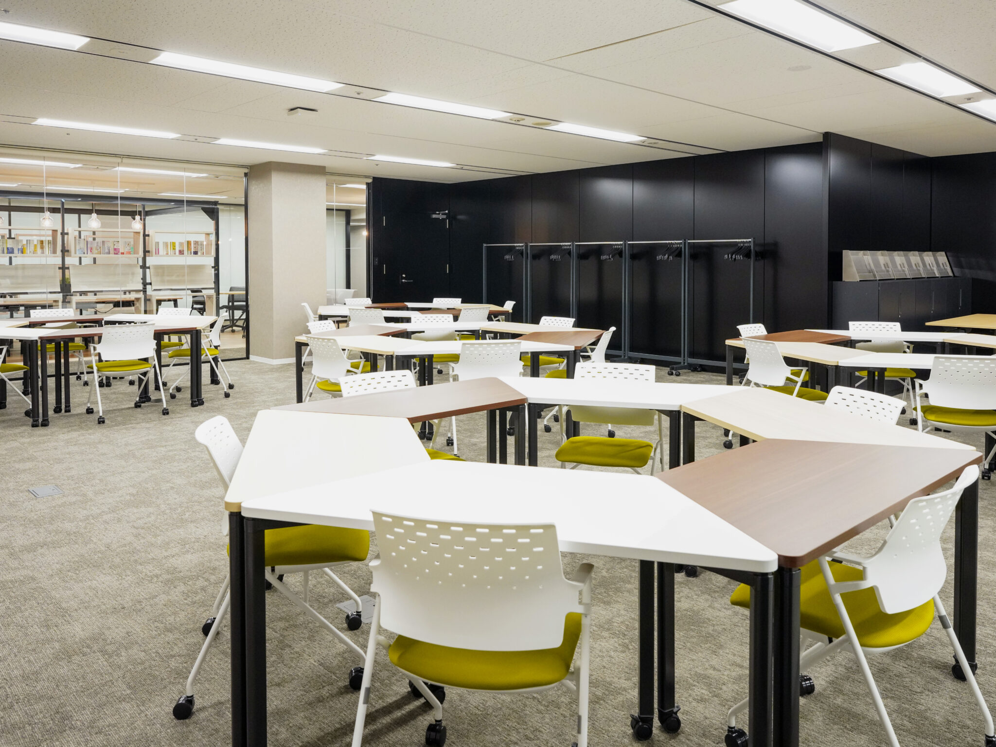 大人数を収容できるセミナールームは、グループワークにも講義スタイルにも自由に変更できるようなエリアになっています。人が集まりやすいエリアの中心には、カフェのように『ほっ』とできる場所をつくり、ソファでくつろぎながら情報収集や、雑談ができるスペースや、フレームに囲まれながら書籍を読んだり、軽い作業が行えるようなスペースを設けました。