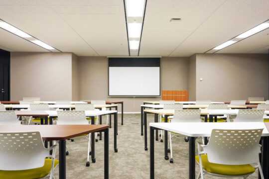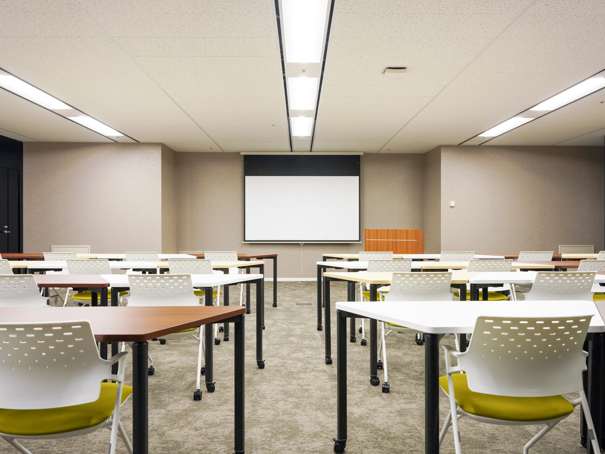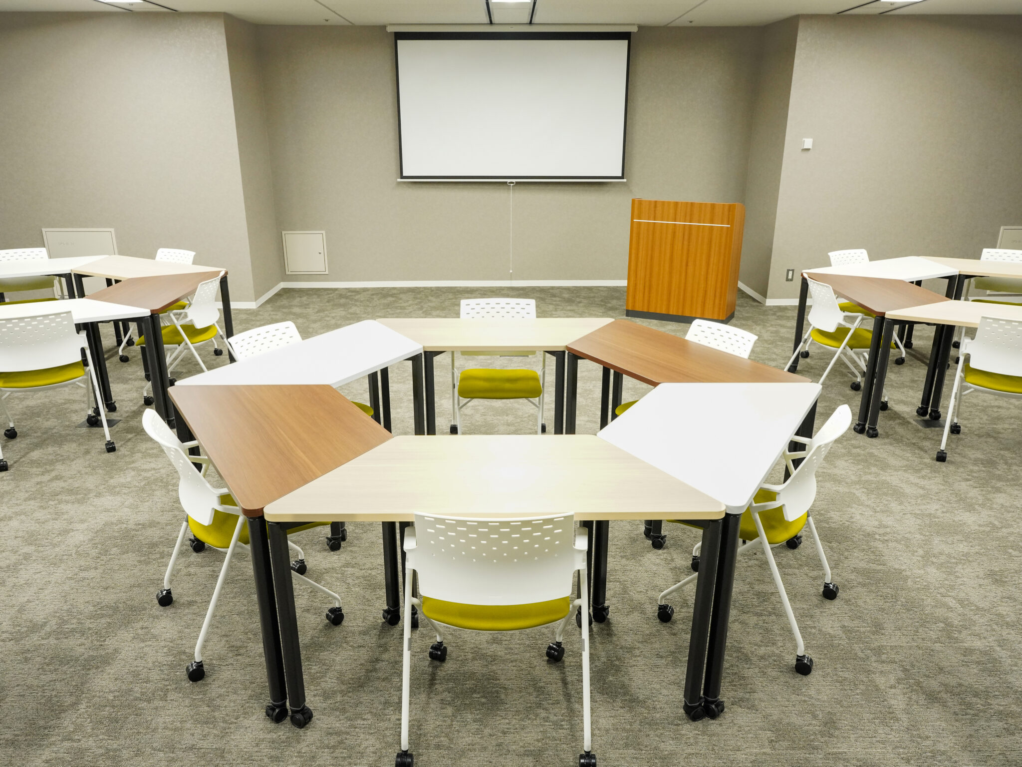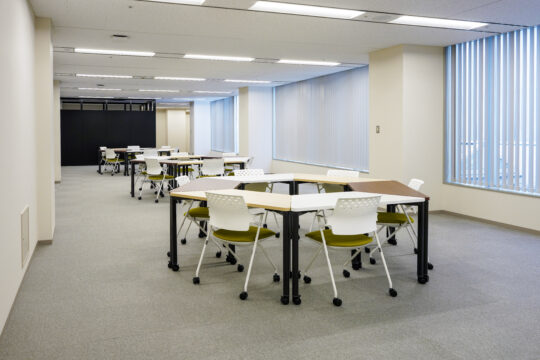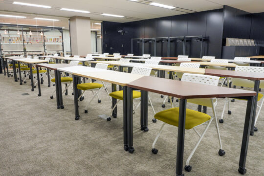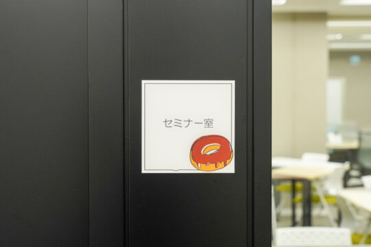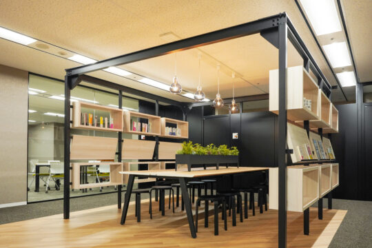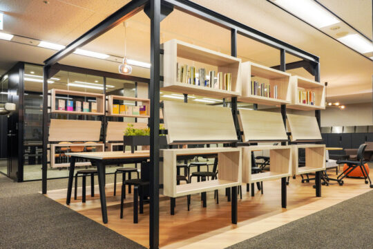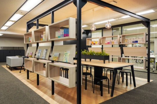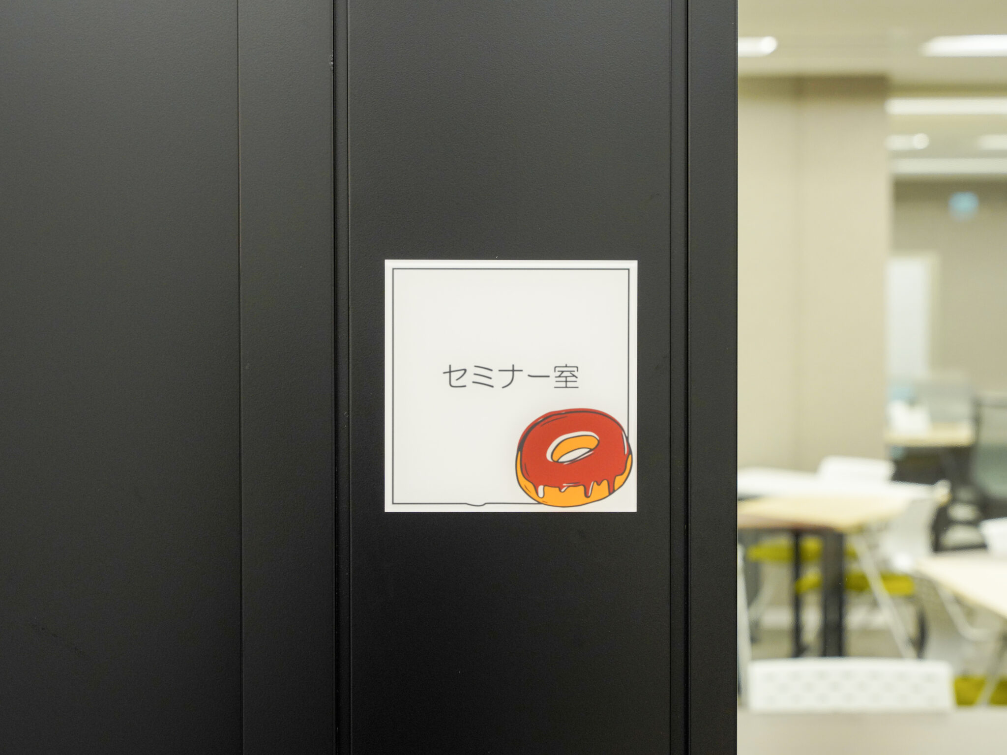 大人数を収容できるセミナールームは、グループワークにも講義スタイルにも自由に変更できるようなエリアになっています。人が集まりやすいエリアの中心には、カフェのように『ほっ』とできる場所をつくり、ソファでくつろぎながら情報収集や、雑談ができるスペースや、フレームに囲まれながら書籍を読んだり、軽い作業が行えるようなスペースを設けました。