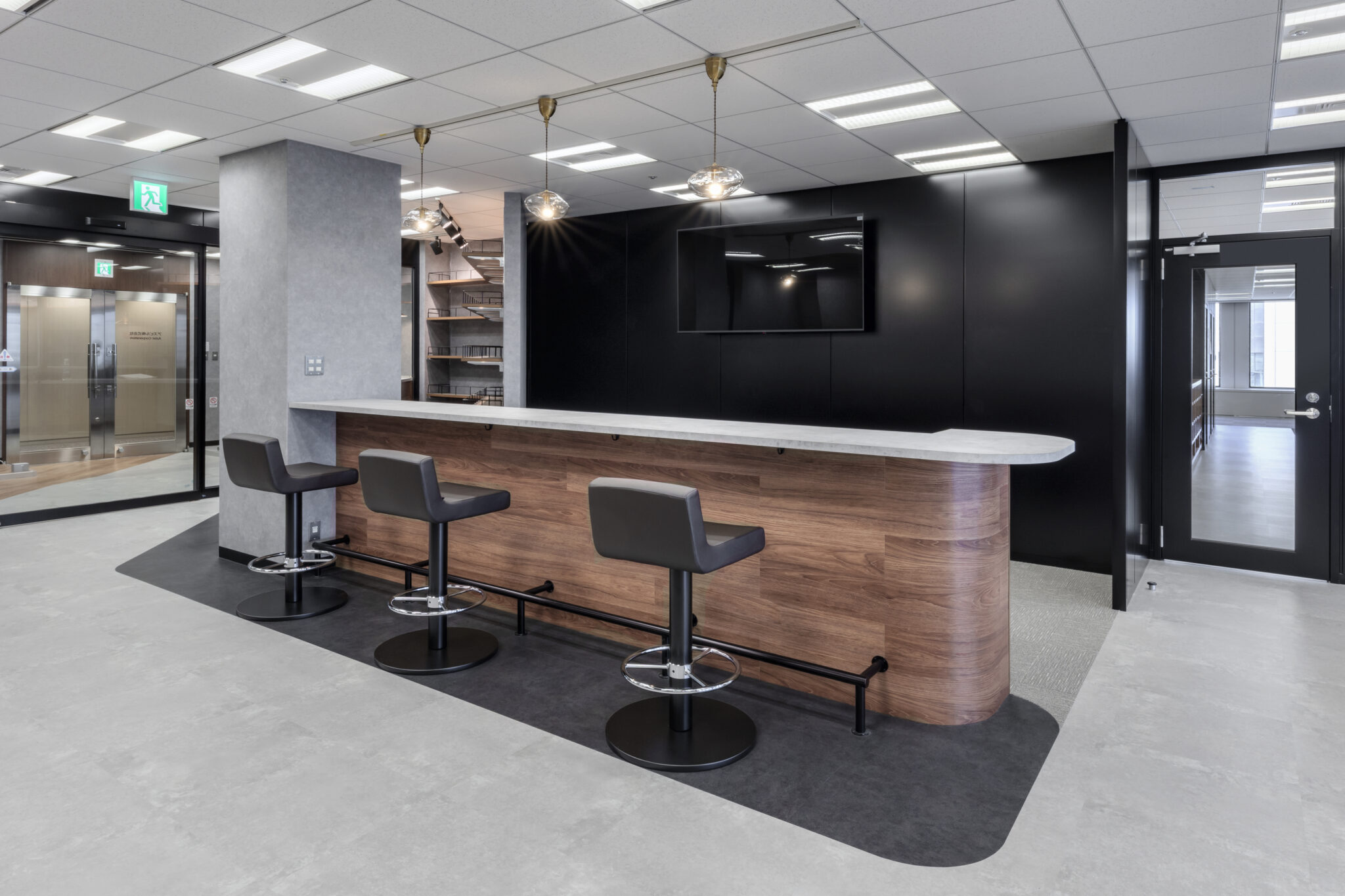 Working café ARK moriの全体的なインテリアは、ウッド調、モルタル調のベース空間をブラックフレームで引き締めることで、都会的で落ち着きのある雰囲気を醸し出すことを目指しています。カフェ空間の顔となる受付部は味のあるブラケットライトでこなれ感を演出。さらに、受付台とガラス越しにつながるカフェカウンターを斜めに配置することで、通路から奥へ視線を誘う効果でオープンな印象を与えることを意識して設計しています。