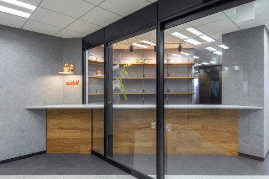 また、ワークエリアはABWを採用し、効率的に働けることを意識した間づくりに。クライアントの「~したい!」という意見をふんだんに取り入れ、多機能な異形ソファやリビングテイストな会議室など、既製品と造作家具を織り交ぜたアズビル社員特化の空間をつくりあげました。