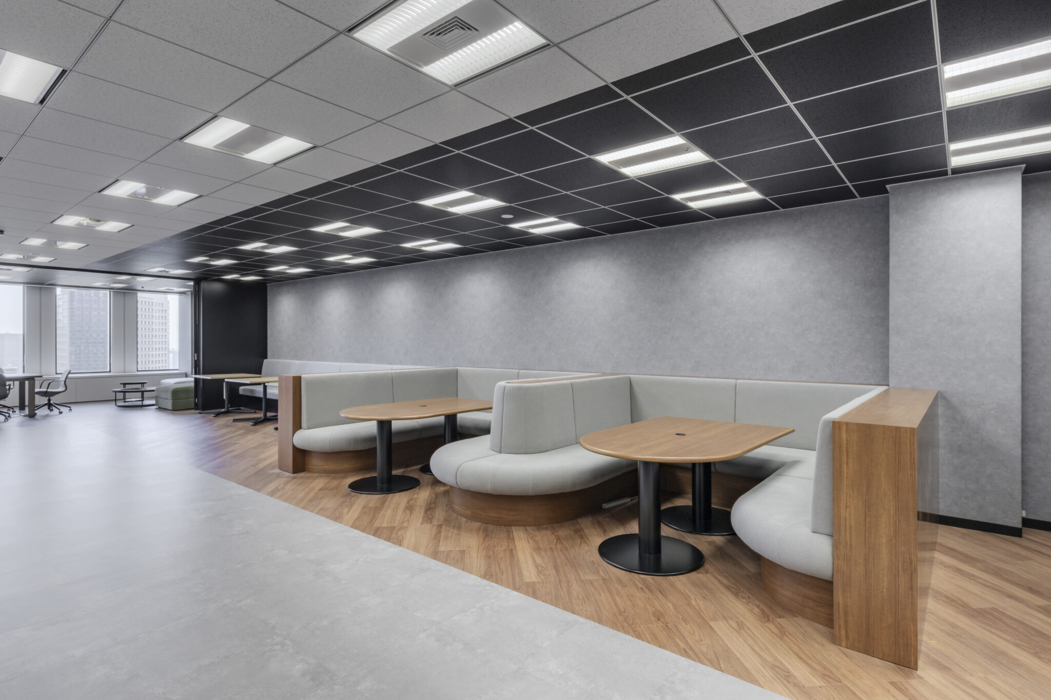 港区中央の立地となる移転先は、多数の社員が営業拠点の一つとして利用することが推測されました。そこで、私たちはカジュアルさ、効率的、サステナブルといったキーワードに焦点を当て、アズビル様にとって働きやすくカスタマイズされたカフェ、「Working café in ARK mori.」の間づくりをスタートさせていきました。