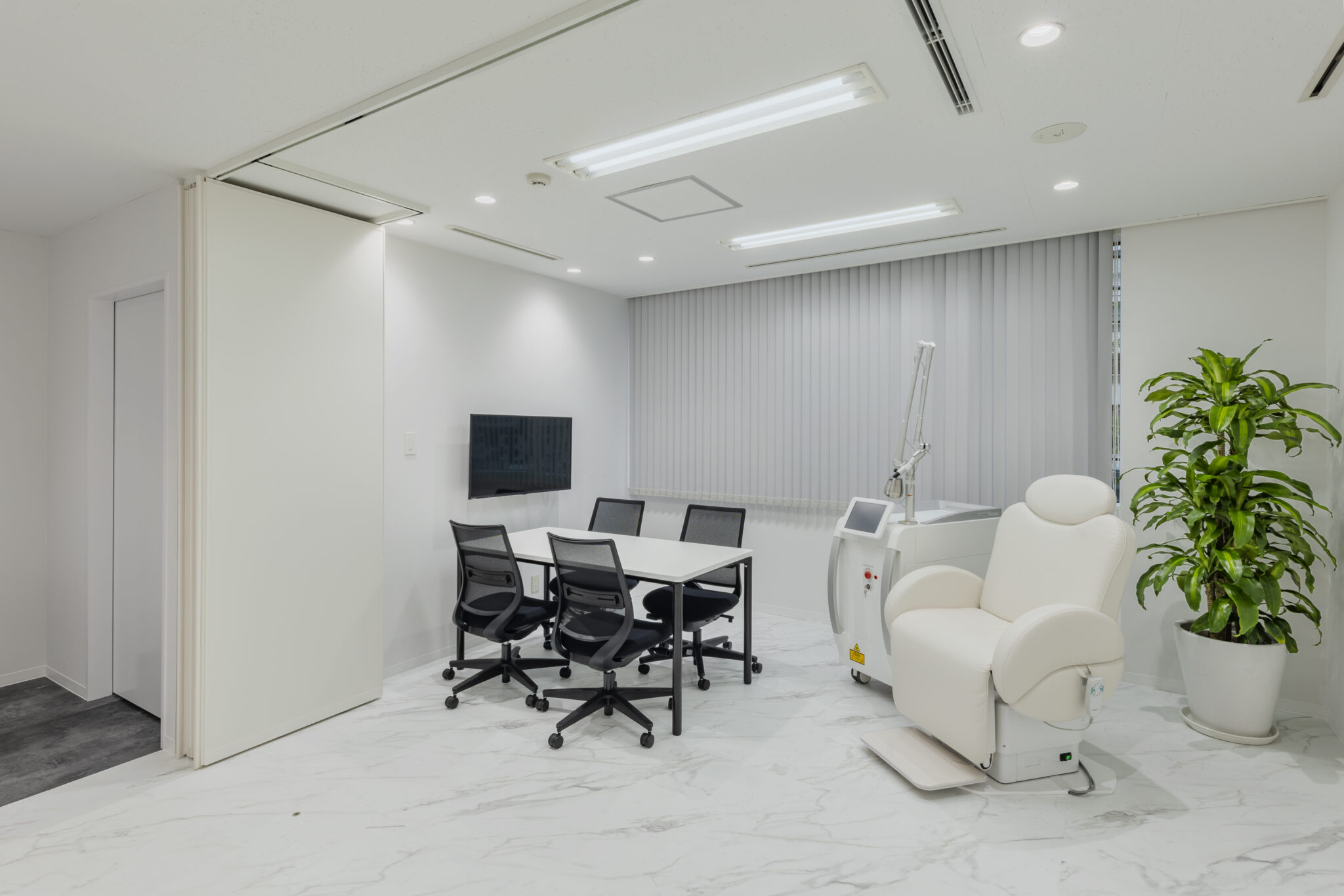 それを受け、今回はショールームに隣接する施術室の壁を可動式の間仕切りとし、