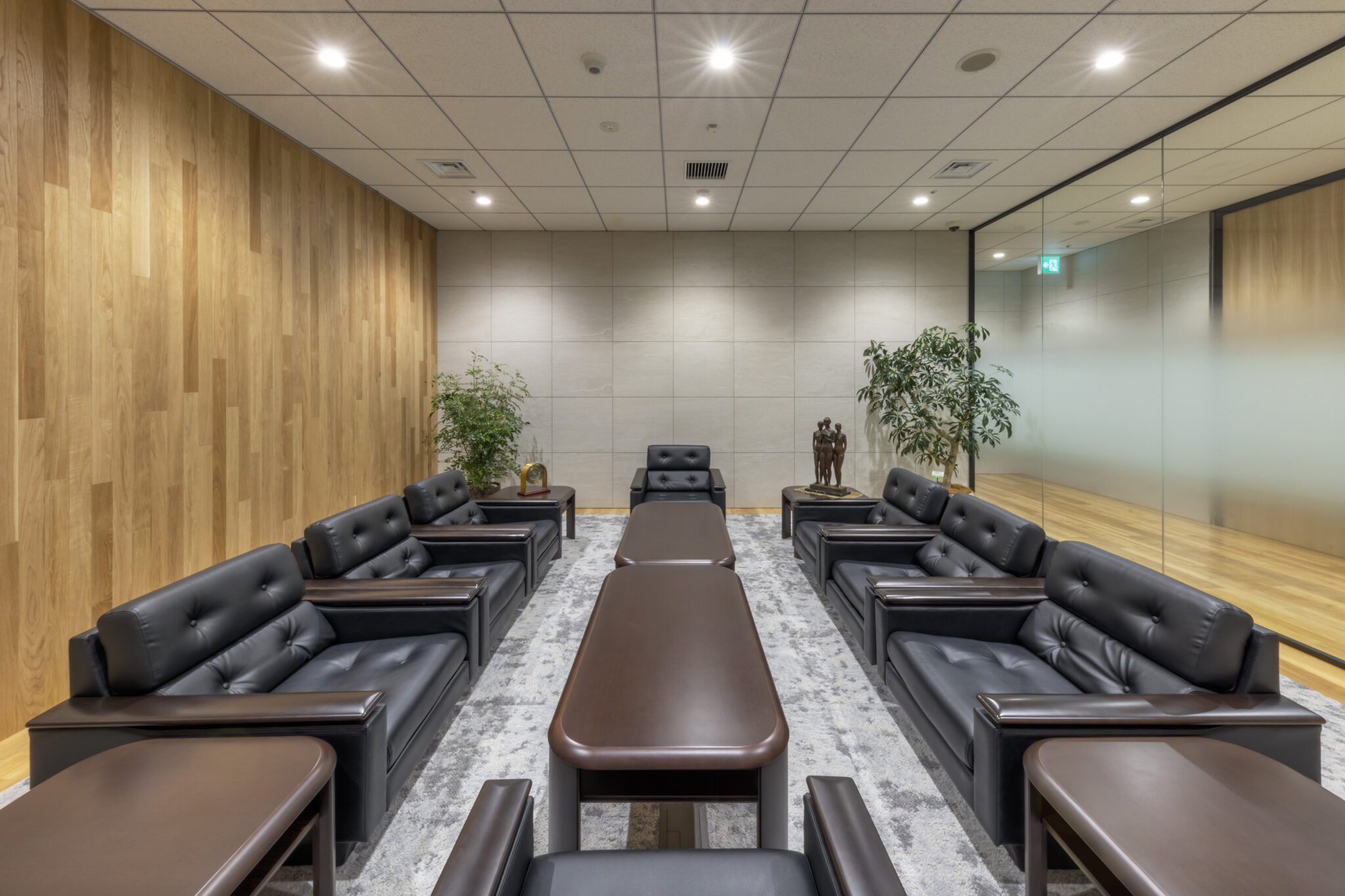 また、その中でも壁面には積層になったタイルを使用し、歴史の長さを表現することで、重厚感も取り入れました。さらに、会議室の床はポイントでごまの色を感じさせるカーペットを一部取り入れることで、かどや様らしさを表現しました。