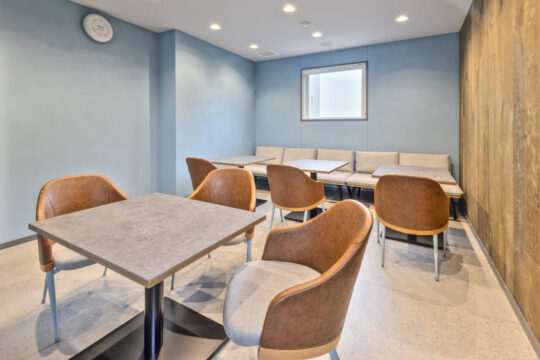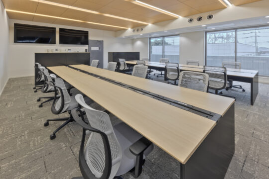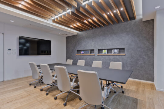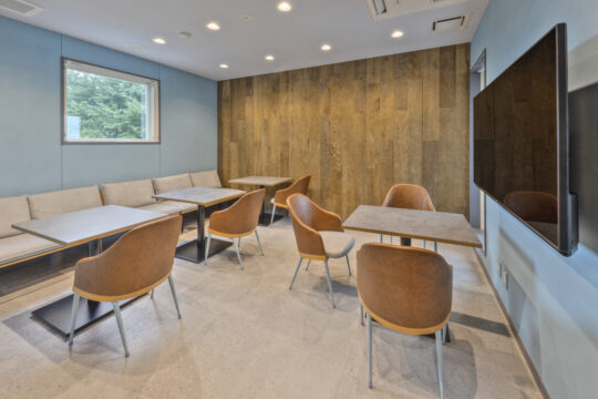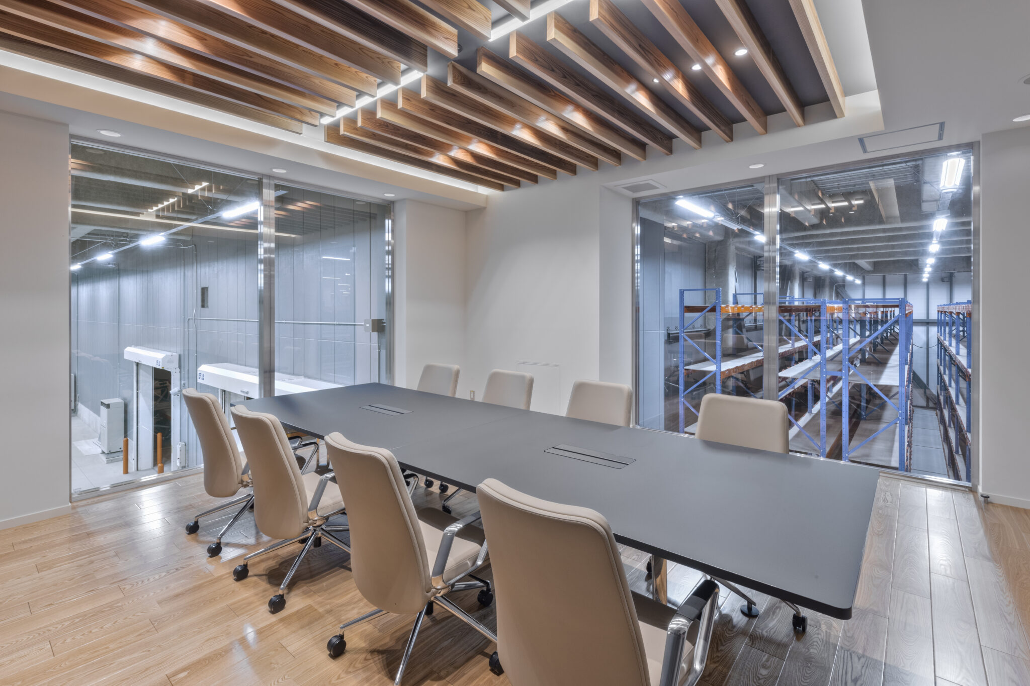 倉庫業務が主になる為、オフィスエリアは限られた時間を過ごす場所だからこそ、ワーカーの気分が変わる空間であることを意識しています。執務室はリビングライクで明るく落ち着きのある環境とし、休憩室は素材感やカラーをアクセントにしたカフェライクで気分が変わる空間としました。会議室は左官塗装や木目にこだわりを感じられる内装と、倉庫が眺められるダイナミックな空間としました。