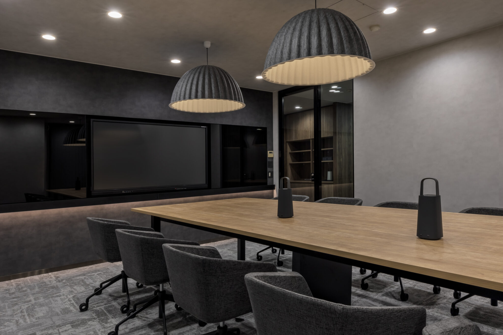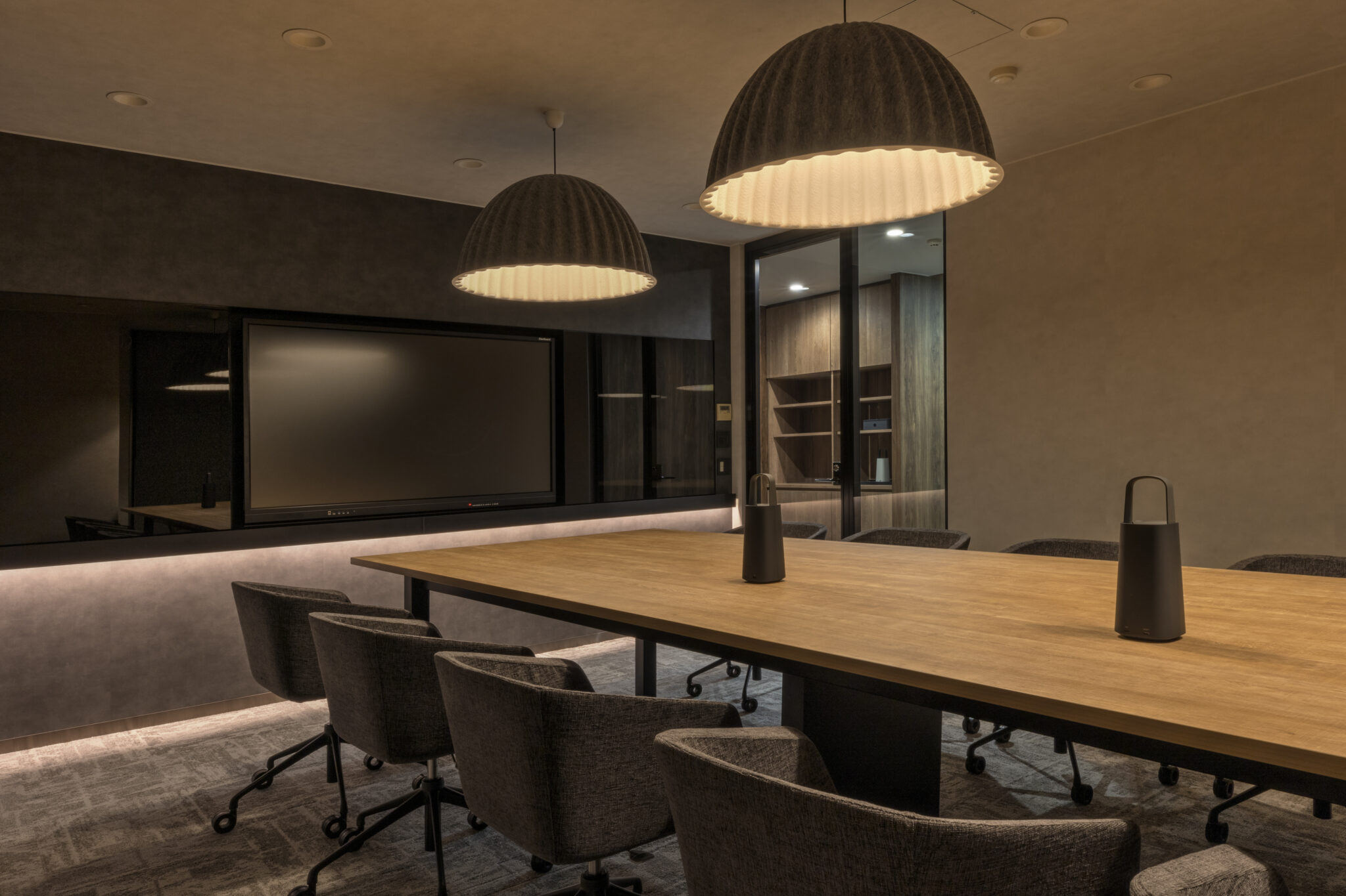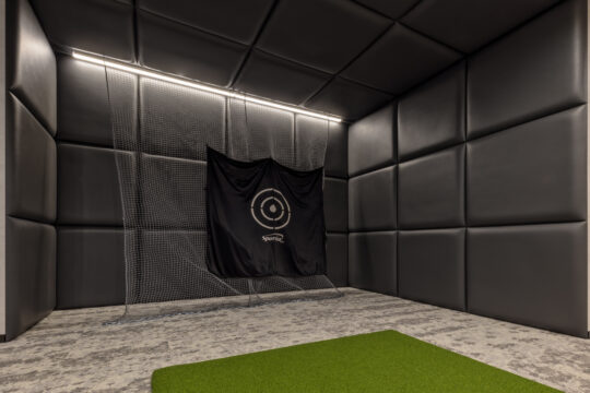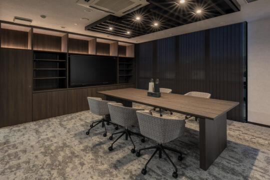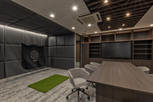 そこで今回社員との距離感を縮める為の一つのチャレンジとして、社長室は自席を無くしミーティングテーブルでの業務に切り替えさらにその様子が見えるように部屋をガラス張りにしました。また社長の趣味の一つでもあるゴルフシミュレーターを設置することで来訪者とのカジュアルなコミュニケーションが生まれる仕掛けづくりも同時に行っています。デザイン面では、ホールとの繋がりを意識し上品さが感じられる素材を中心に選定しながらもカジュアルな雰囲気を纏う空間づくりを心掛けると同時にライティング面でも色温度を調節できることでより活発なコミュニケーションが誘発されるような演出を心掛けました。