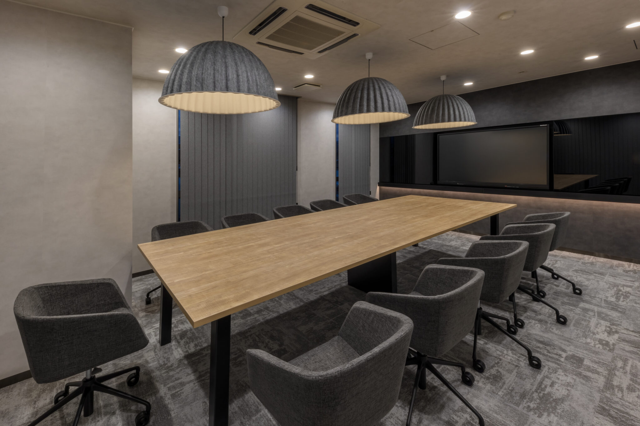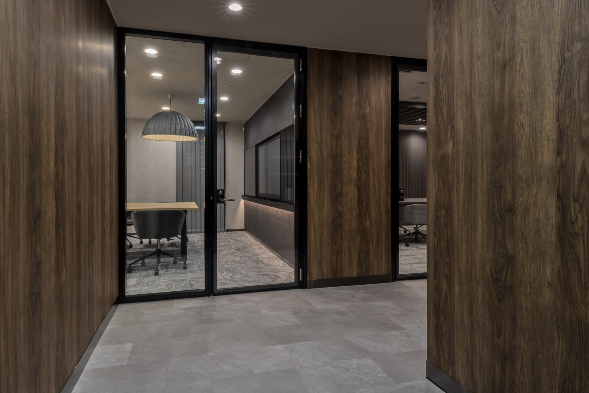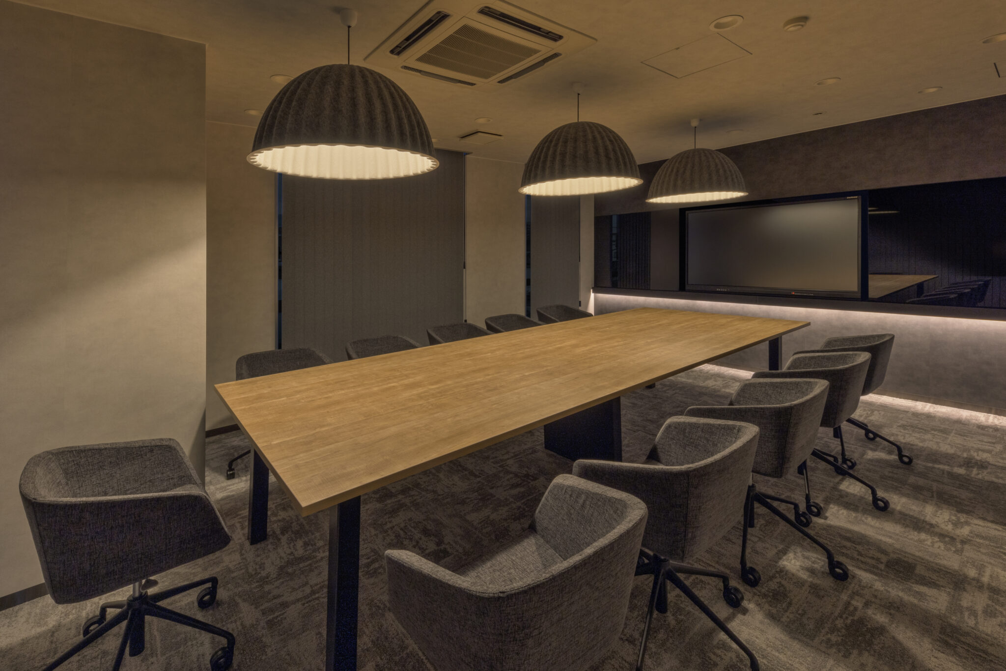 そこで今回社員との距離感を縮める為の一つのチャレンジとして、社長室は自席を無くしミーティングテーブルでの業務に切り替えさらにその様子が見えるように部屋をガラス張りにしました。また社長の趣味の一つでもあるゴルフシミュレーターを設置することで来訪者とのカジュアルなコミュニケーションが生まれる仕掛けづくりも同時に行っています。デザイン面では、ホールとの繋がりを意識し上品さが感じられる素材を中心に選定しながらもカジュアルな雰囲気を纏う空間づくりを心掛けると同時にライティング面でも色温度を調節できることでより活発なコミュニケーションが誘発されるような演出を心掛けました。