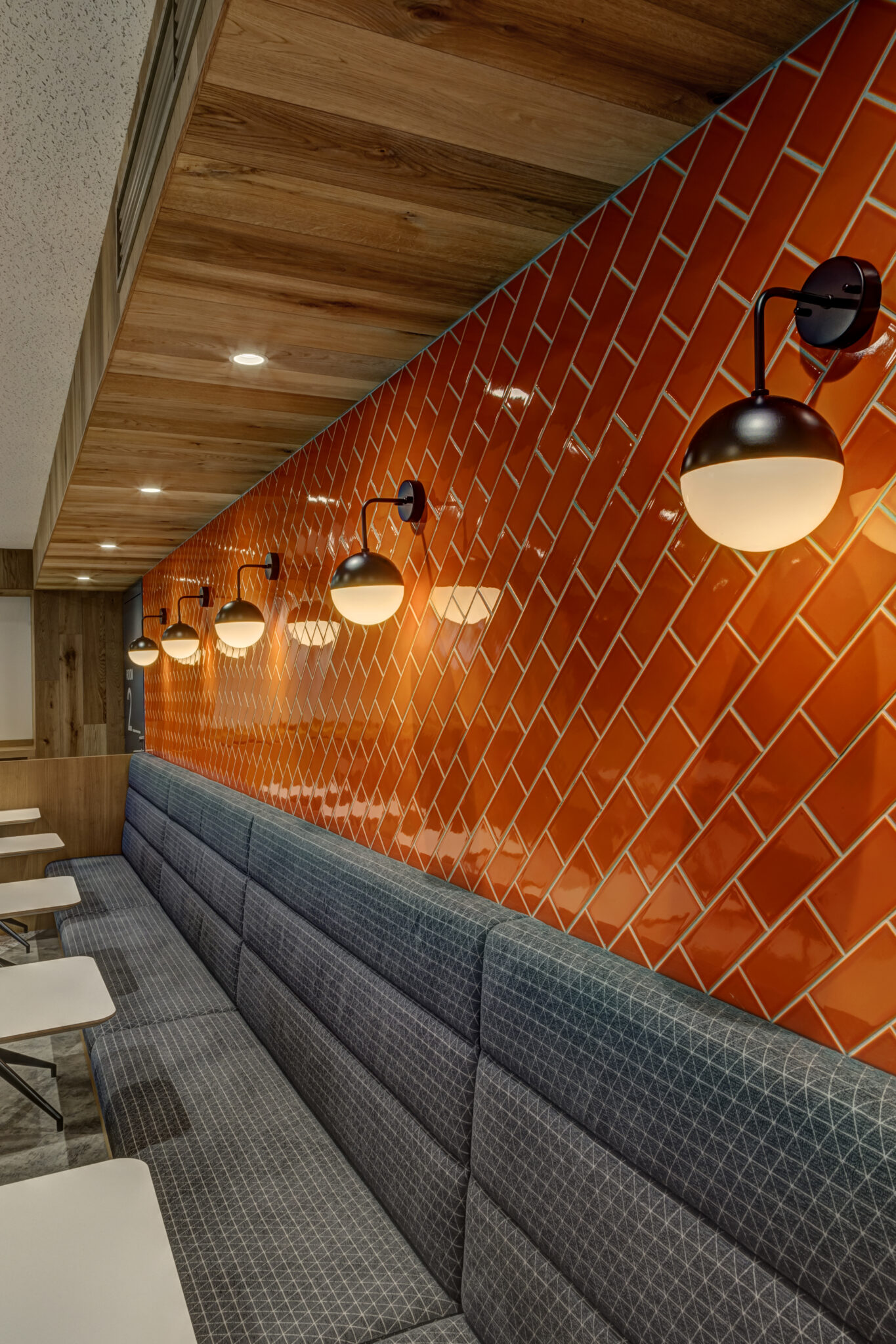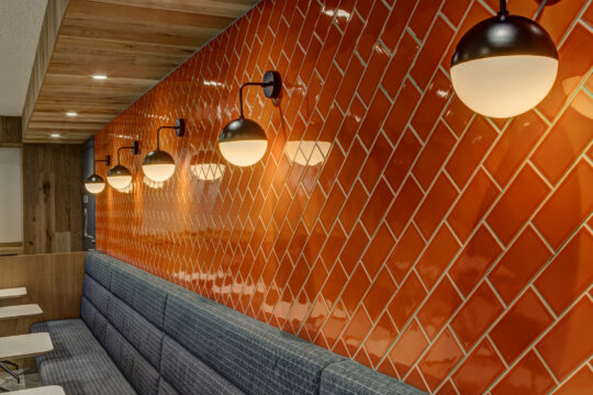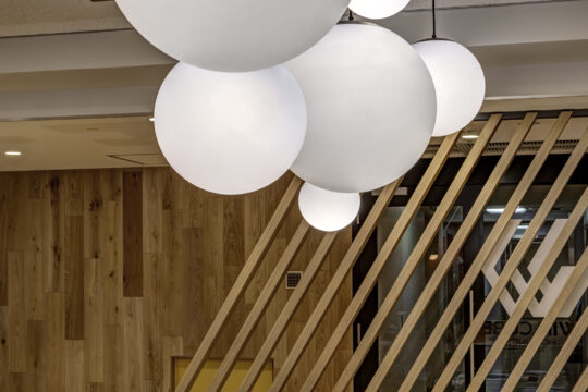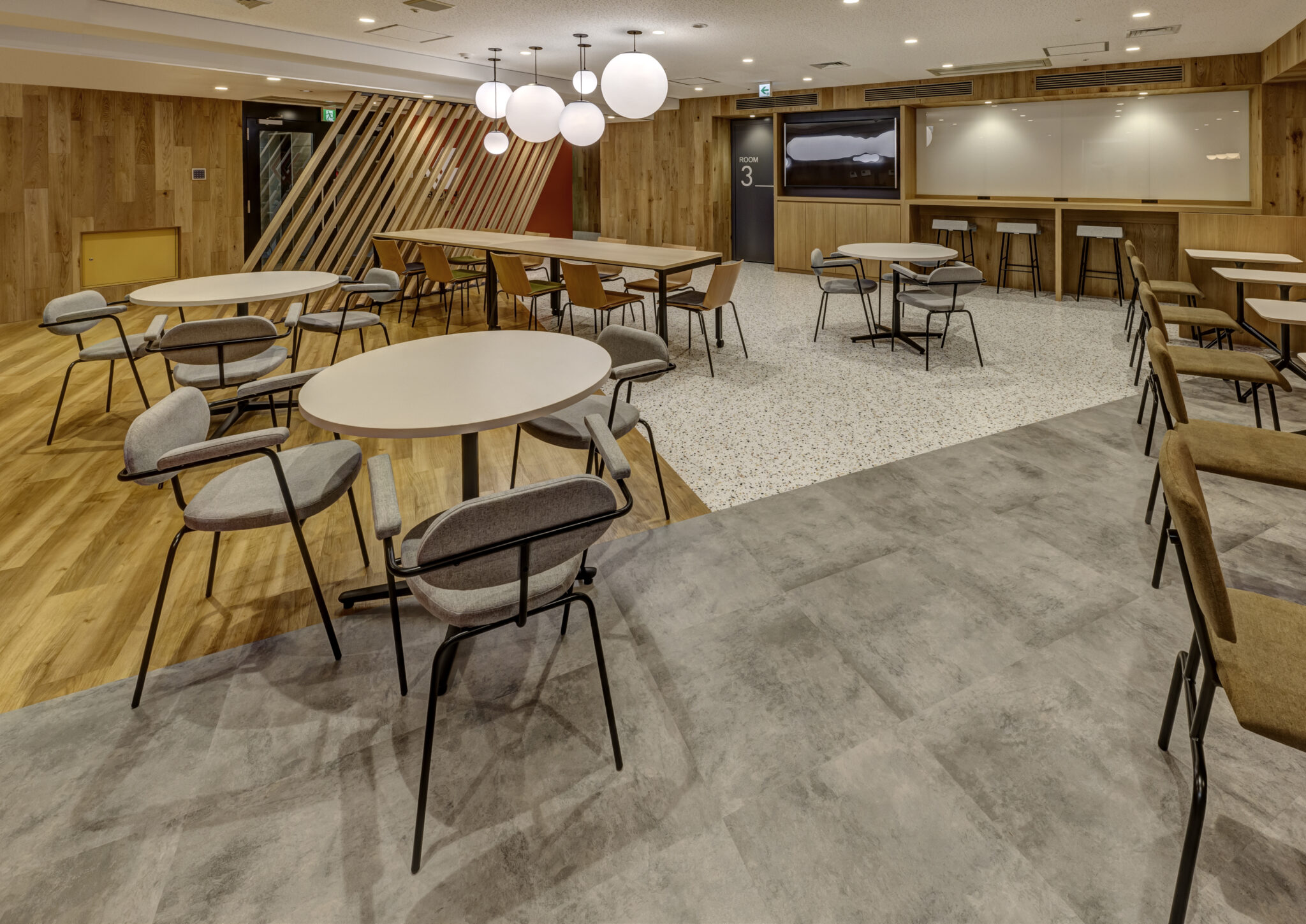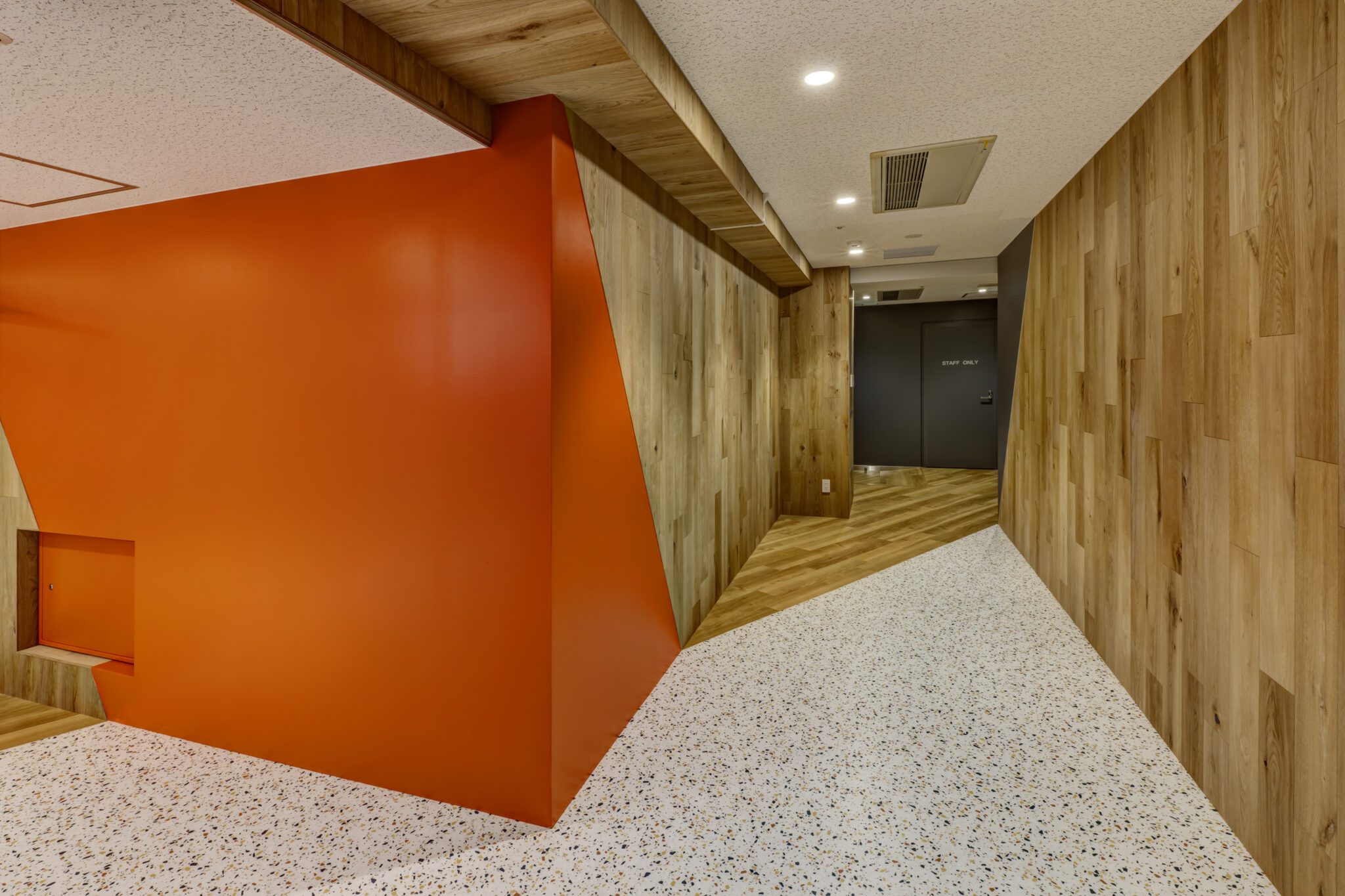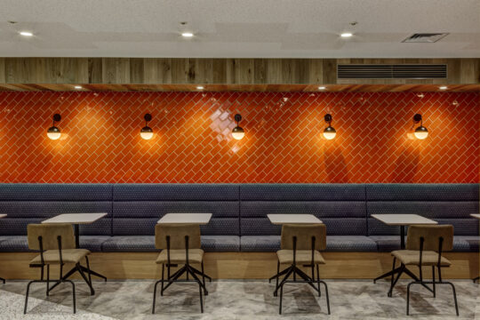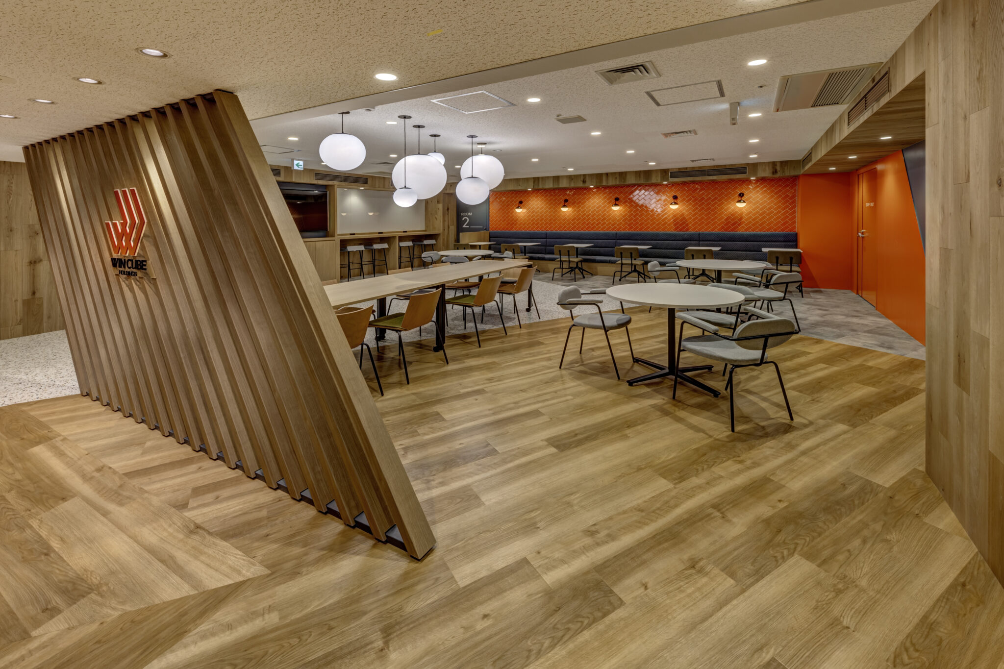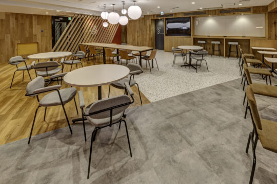 新しいセミナールームのレイアウトではホールを空間の中心に据え、その周りにセミナールームを配置することで参加者同士の積極的な交流を促すレイアウトにしました。デザイン面においては本社デザインとの空間的つながりを考え、雰囲気は変えずにセミナールームに来られた方の印象に残るようにコーポレートカラーのオレンジをアクセントカラーに用い、活気が自然とあふれてくるような空間を目指しました。
